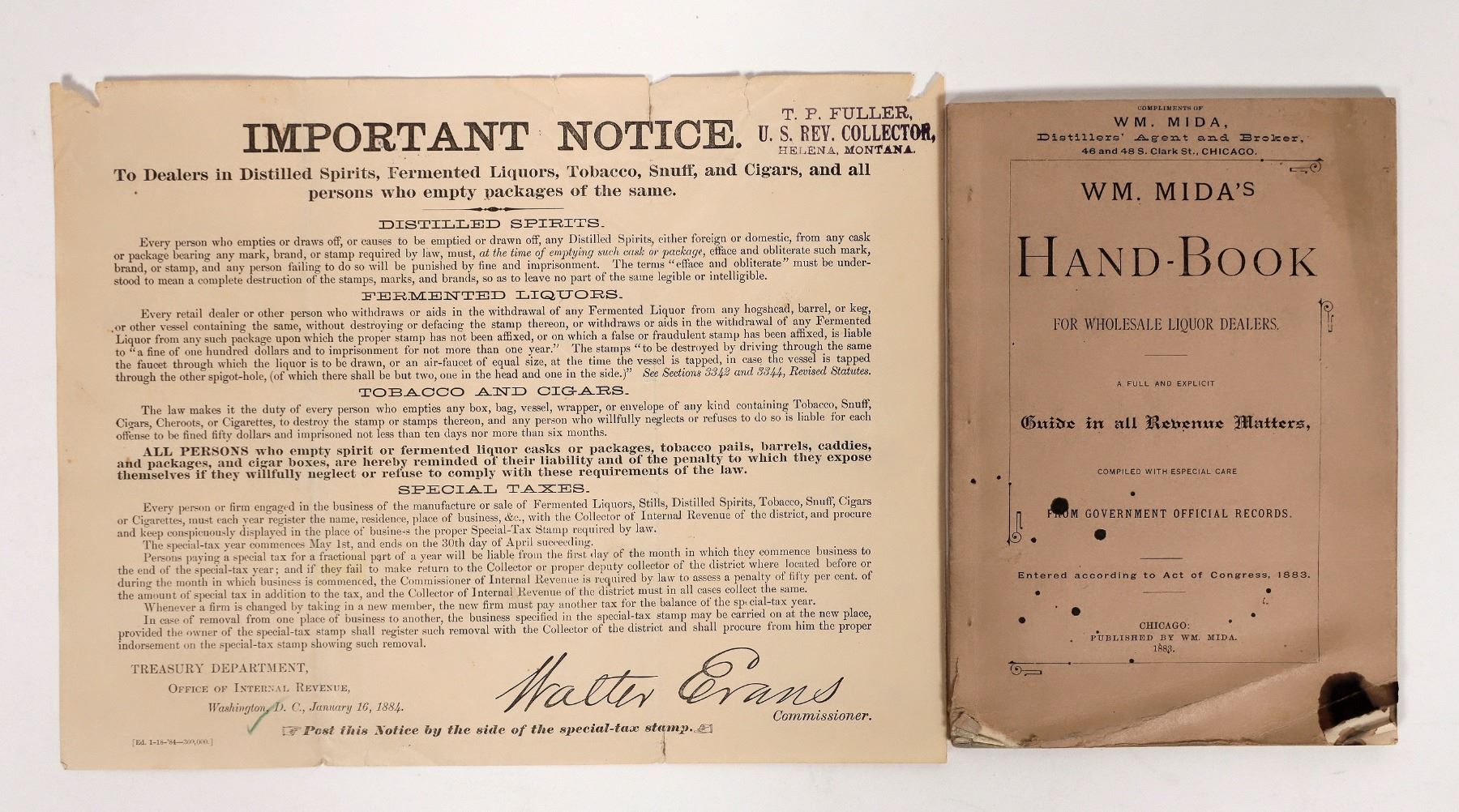 1883 Wm. Mida's Hand-Book for Wholesale Liquor Dealers, 68pp with guidelines for laws and regulations of the wholesale liquor business. Includes a JH Cutter ad. Front cover lower corner chip and stain which gets lighter thru page 10. Also, 1884 notice regarding effacing and obliterating tax stamps on opened vessels of alcohol and tobacco.
