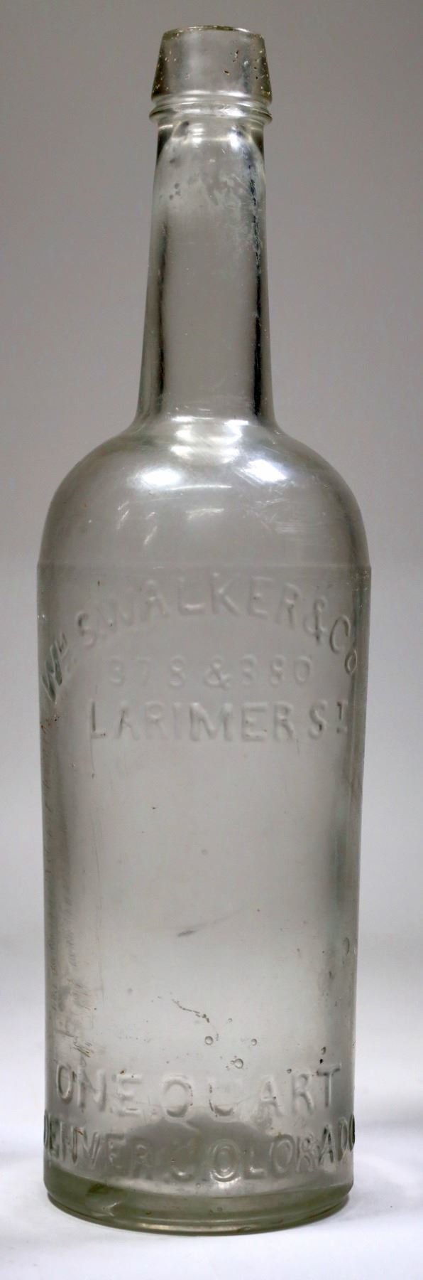 Preble W-76. Wm. S. Walker & Co. / 378 & 380 / Larimer St / One Quart / Denver, Colorado. c.1886. Flint glass, bubble burst on base, some uneven surfaces. 12 1/8" Please inspect.