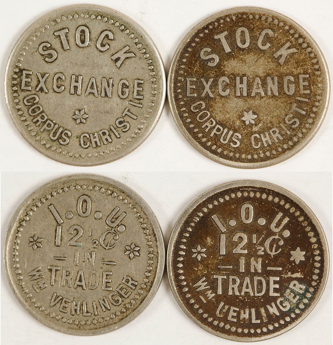 Two I.O.U. 12 1/2 c IT Stock Exchange tokens from Wm. Vehlinger. WM/R/12mm. Date: Location: Corpus Christi, Texas HWAC# 64111