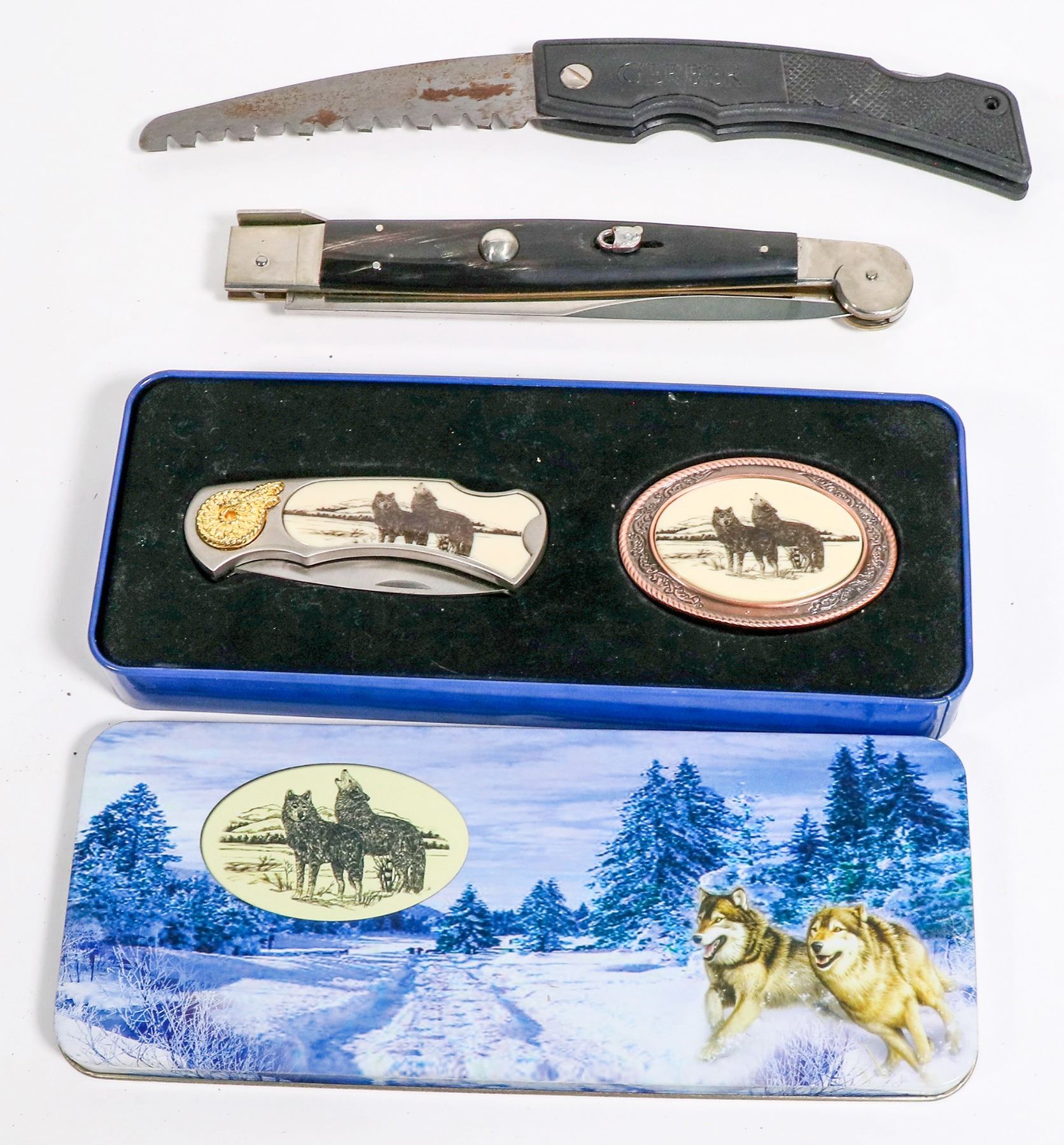 This is the wolf folder and belt buckle in a collectible presentation tin. Maker is unknown, new in the box with matching belt buckle. A Gerber folding camp saw light weight 6.5 in. A large folding dagger blade knife at 8.5 in folded and 16 in. when open, assisted opening shows handling wear.