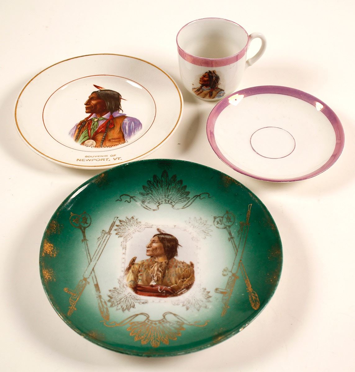 Lot of 4: 1) Green plate designed for hanging with the old Royal Saxe E.S. Germany mark. Wold Robe, Cheyenne chief plate produced c.1900's. Border in gilt with headresses at the corners, peace pipes and other unique Native American items all in gilt. Scratches, and wear. 7.25 diameter. 2) Souvenir plate of Newport, VT of Wolf robe. 6.25" diameter, good condition. 3) Small cup and saucer,image of Wolf Robe on cup. Date: Location: HWAC# 71049