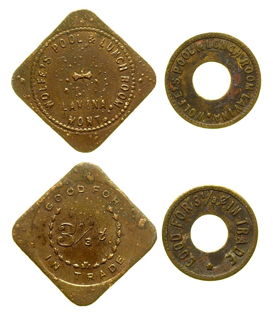 Wolfe's Pool & Lunch Room. Two tokens. Both good for 3 1/3 cents. Very rare. See photo for details. (Svoboda Collection) City: Lavina State: Montana Date: HWAC# 35952