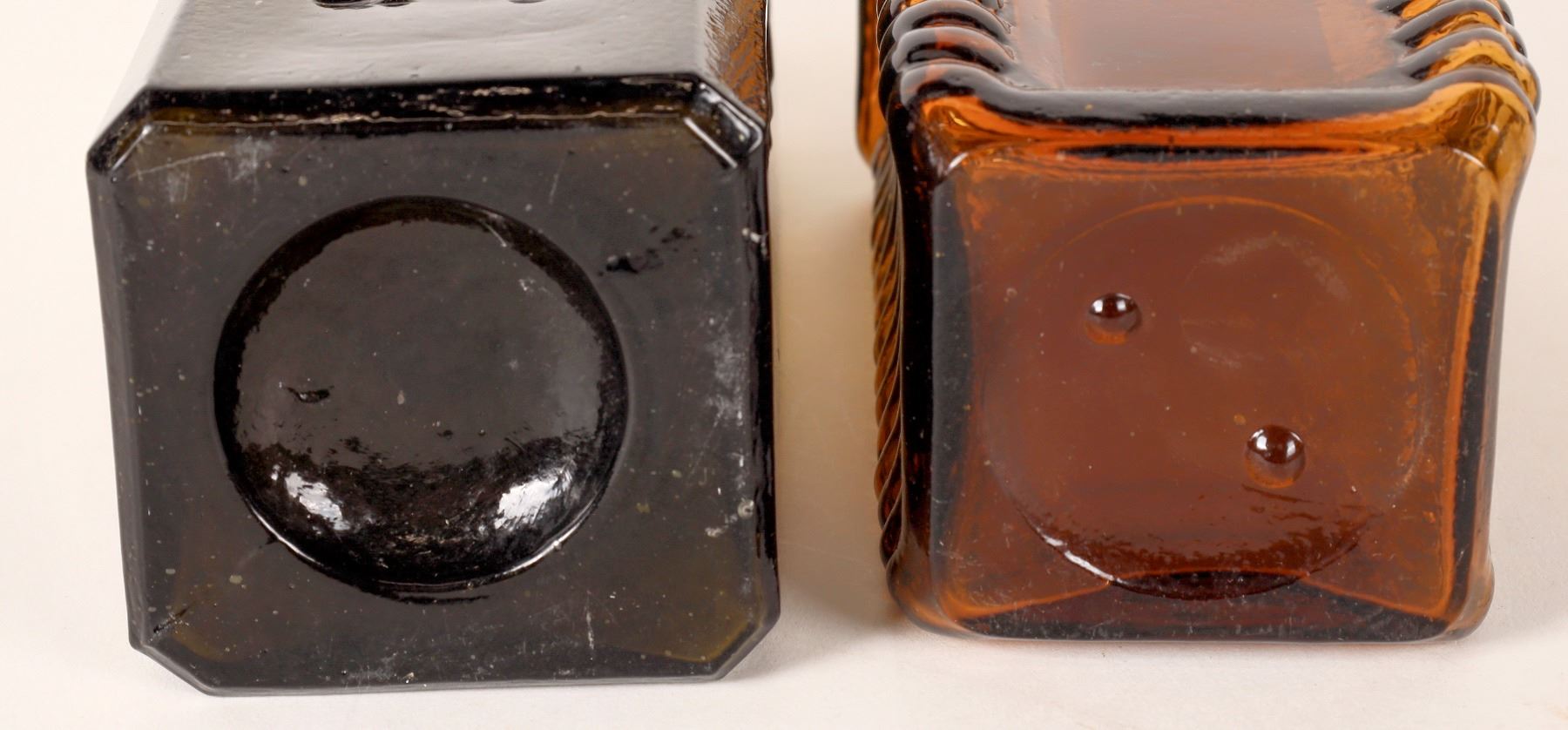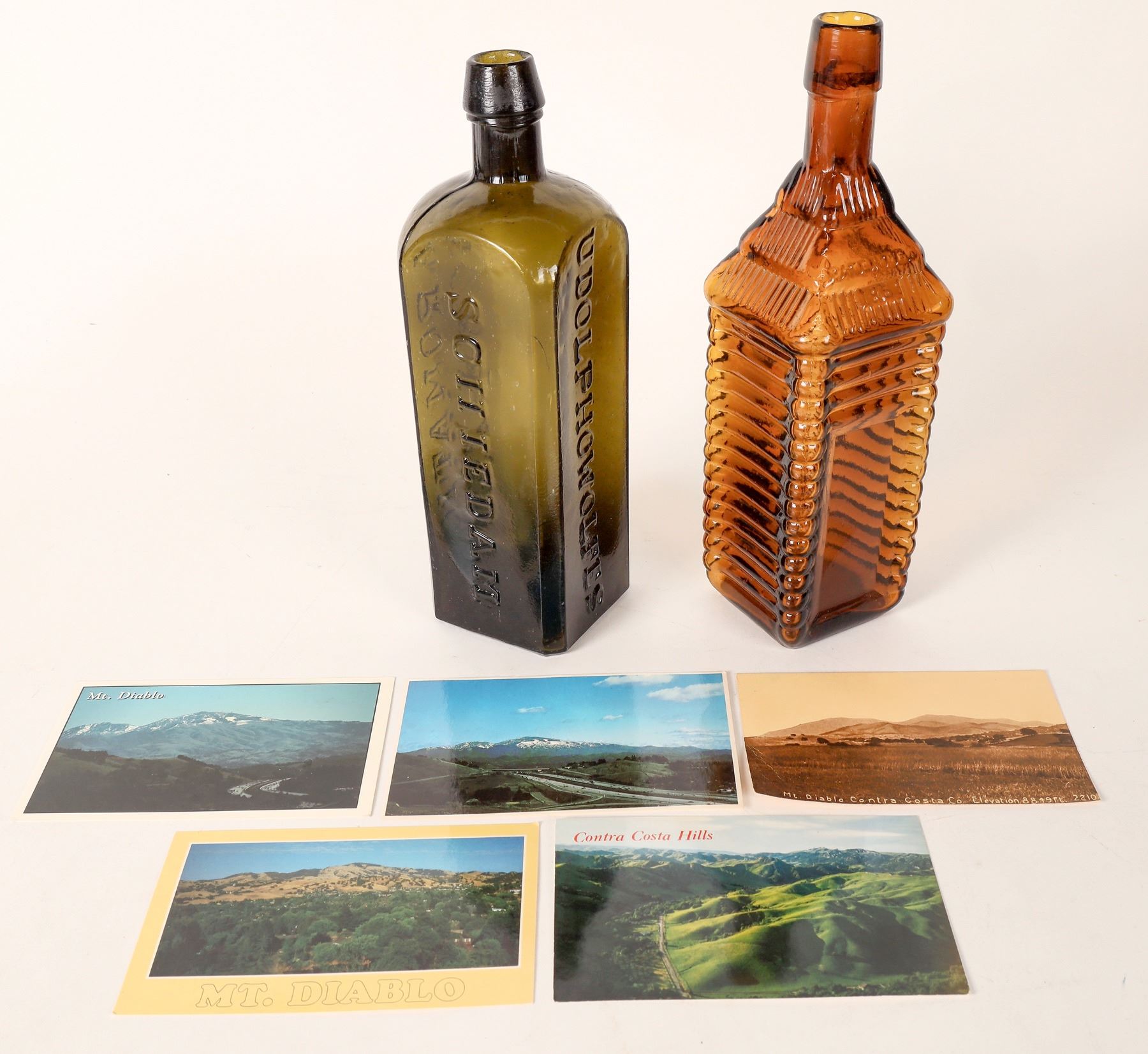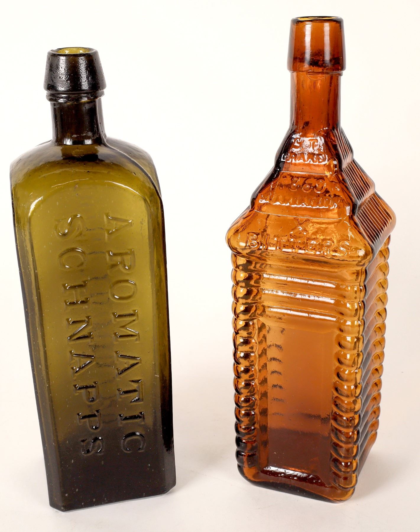 Dark green Udolpho Wolfes/Schiedam/Aromatic Bitters, mint condition! Long neck 4 log Drakes Plantation Bitters in medium amber, no apparent chips or cracks.