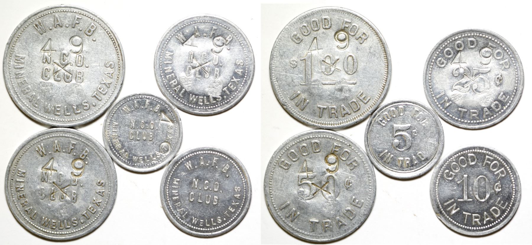 Five metal tokens good for at NCO Club. Some counter stamped. Date: City: Mineral Wells State: Texas HWAC# 75411
