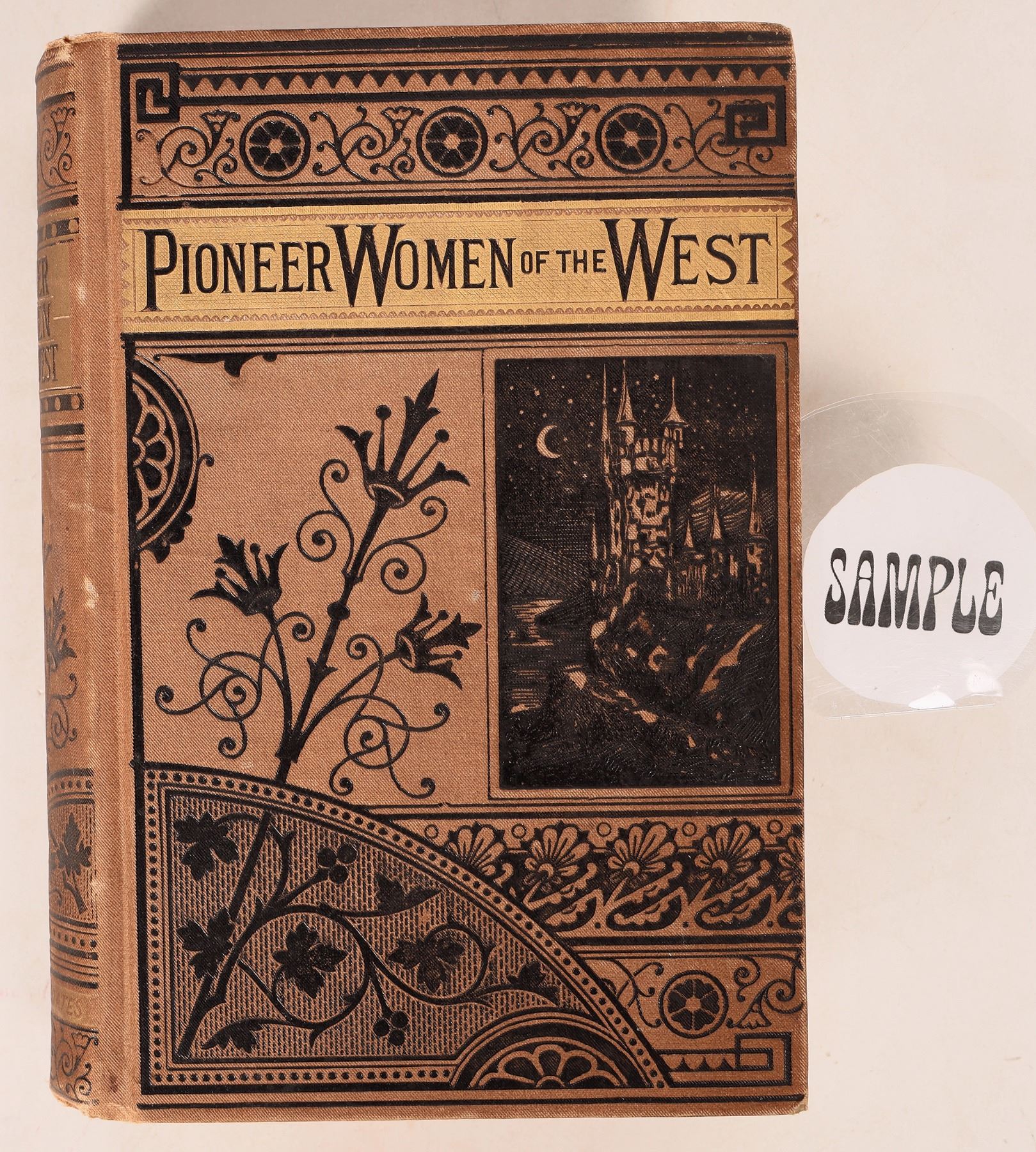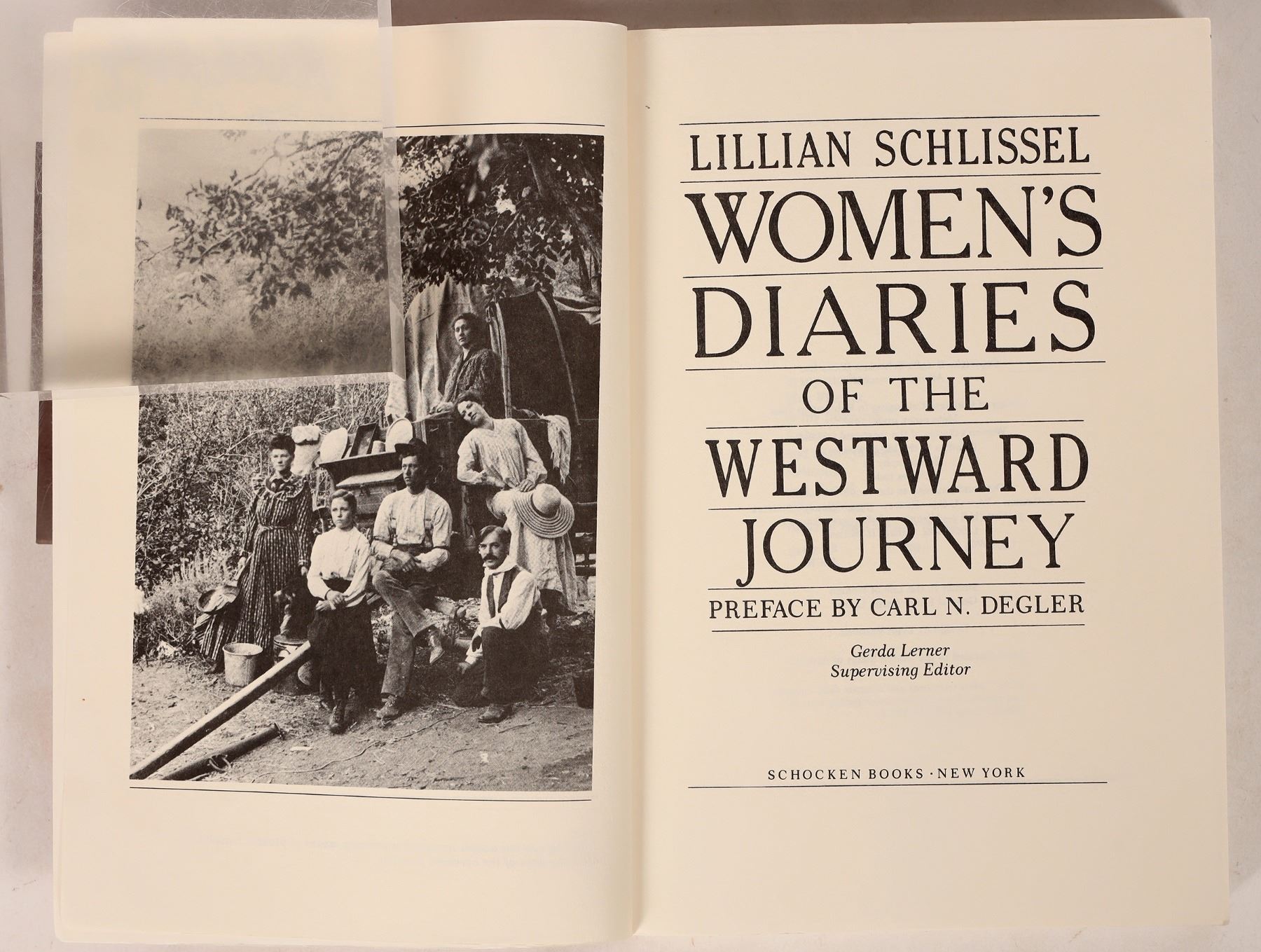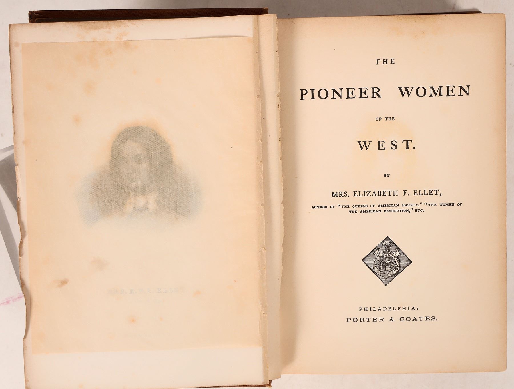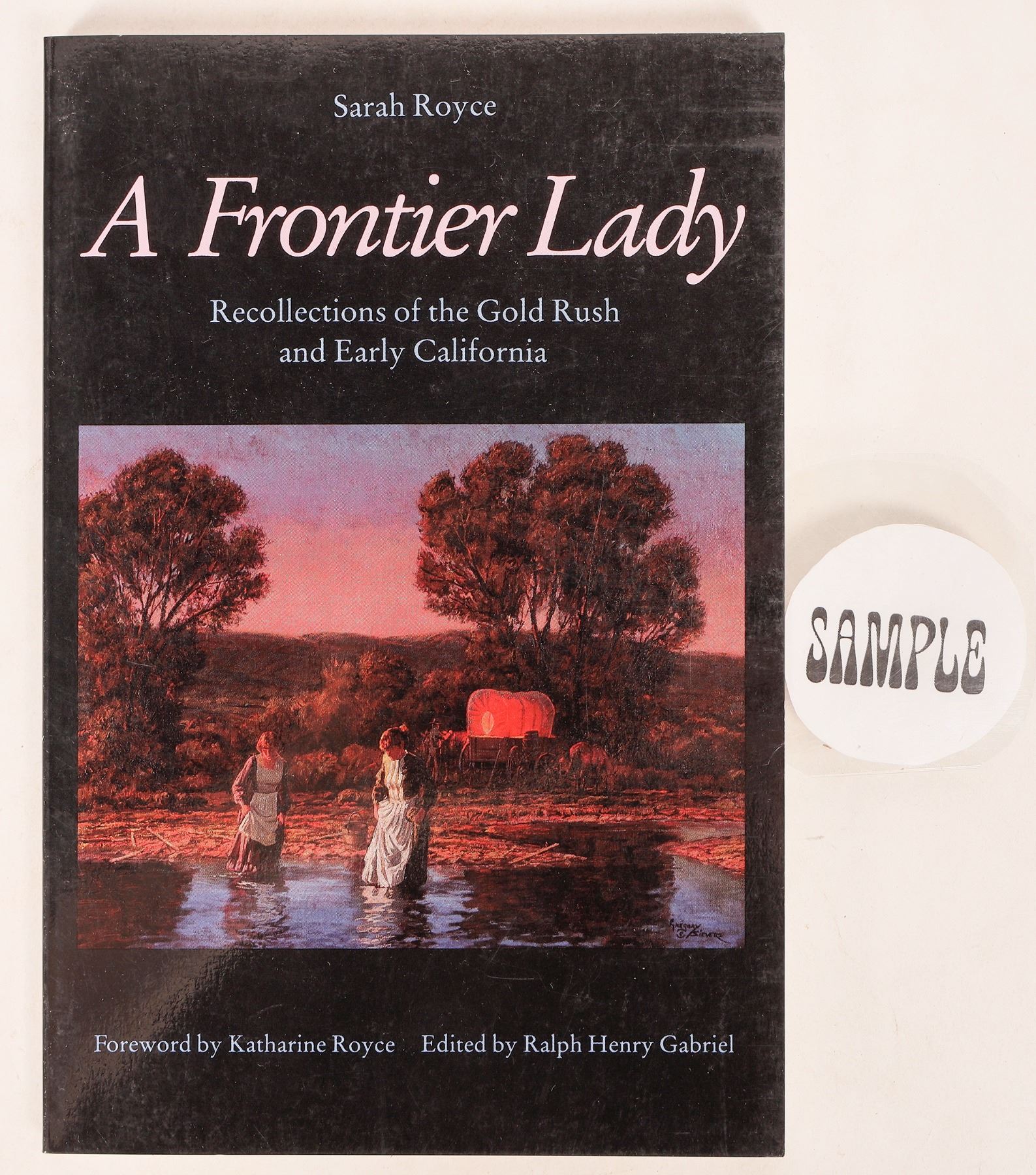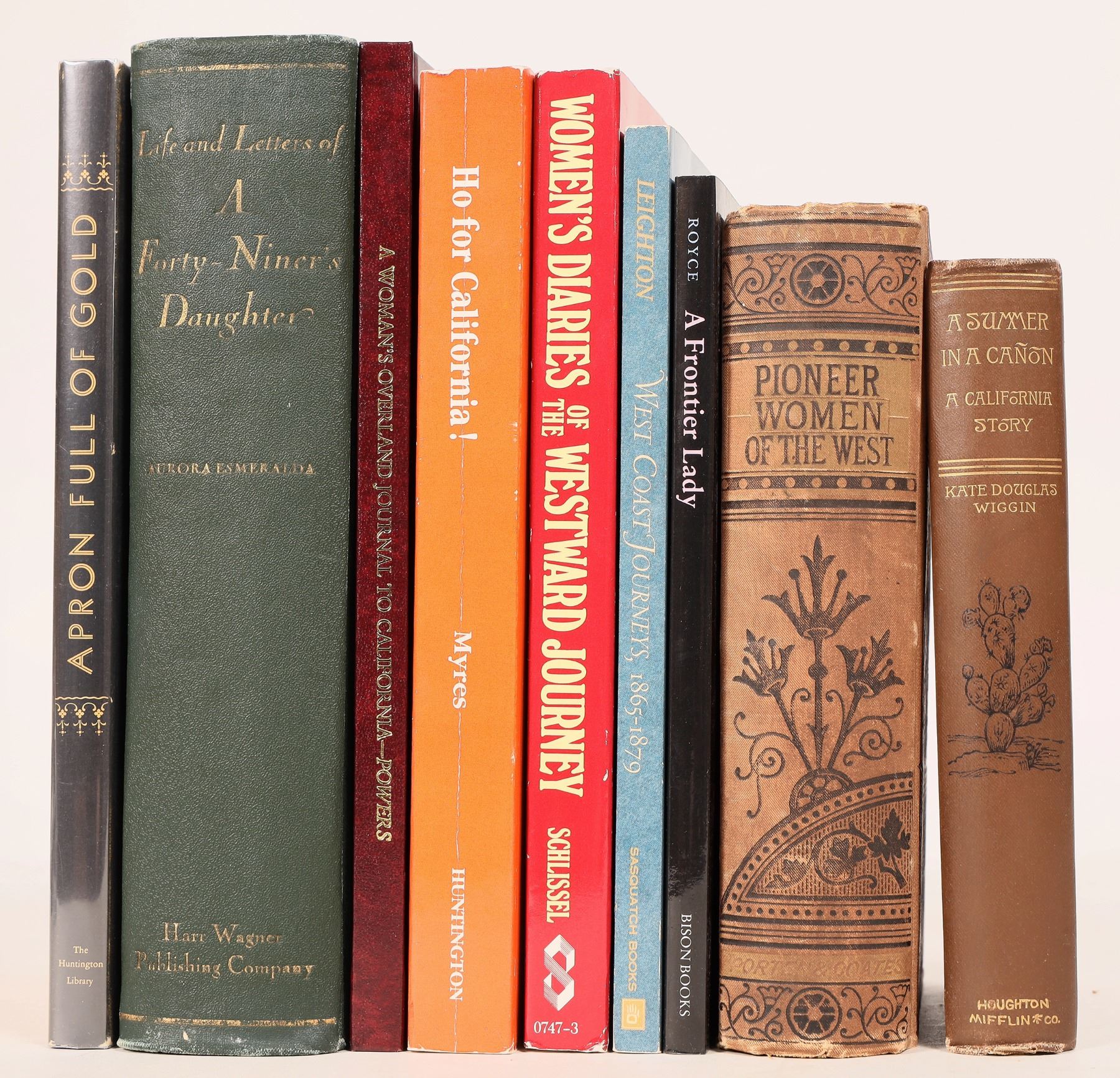 A small library of eight books about pioneer women in the West. Includes: The Pioneer Women of the West, Mrs. Elizabeth F. Ellet, author of "The Queens of American Society," and "The Women of the American Revolution," etc., late 1800s, 5x7.5", 434 pp., fly leaf page and front board detached, foxing, spine slightly worn at top and bottom and corners at bottom; A Summer in a Canyon: A California Story, Kate Douglas Wiggin, first edition, 1889, fictional story takes place in Canyon Las Flores, 5x7", 272 pp., light foxing, light wear spine edges; Life and Letters of A Forty-Niner's Daughter, Aurora Esmeralda (Ella Sterling Mighels), introduction to the Story of the Descendent of Sterling B.F. Clark, first printing, 550/1600, 1929, 6.5x9", 371 pp., slight wear upper and lower front corners; Apron Full of Gold, the letters of Mary Jane Megquier from San Francisco, 1849-1856, Editor Robert Glass Cleland, 1949, 6x9", 99 pp., dust jacket, fine; West Coast Journeys 1865-1879, the Travelogue of a Remarkable Woman, Caroline C. Leighton, 1995, 5.5x8.5", paperback, 166 pp., very good; Women's Diaries of the Westward Journey, Lillian Schlissel, 1982, 6x9", paperback, 262 pp., very good; Ho for California!, Women's Overland Diaries from the Huntington Library, edited and annotated by Sandra L. Myres, 1980, 6x9", paperback, 314 pp., very good; A Frontier Lady, Recollections of the Gold Rush and Early California, Sarah Royce, 1977, 5x8", paperback, 140 pp., fine; A Woman's Overland Journal to California, Mary Rockwood Powers, 1985, author died in 1858, her journal first appeared in Amateur Book Collector/American Book Collector, Vol. I, Nos. 1-5, September 1950, 6x9", 73 pp., fine.