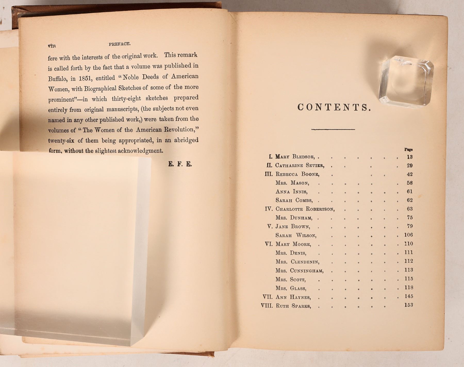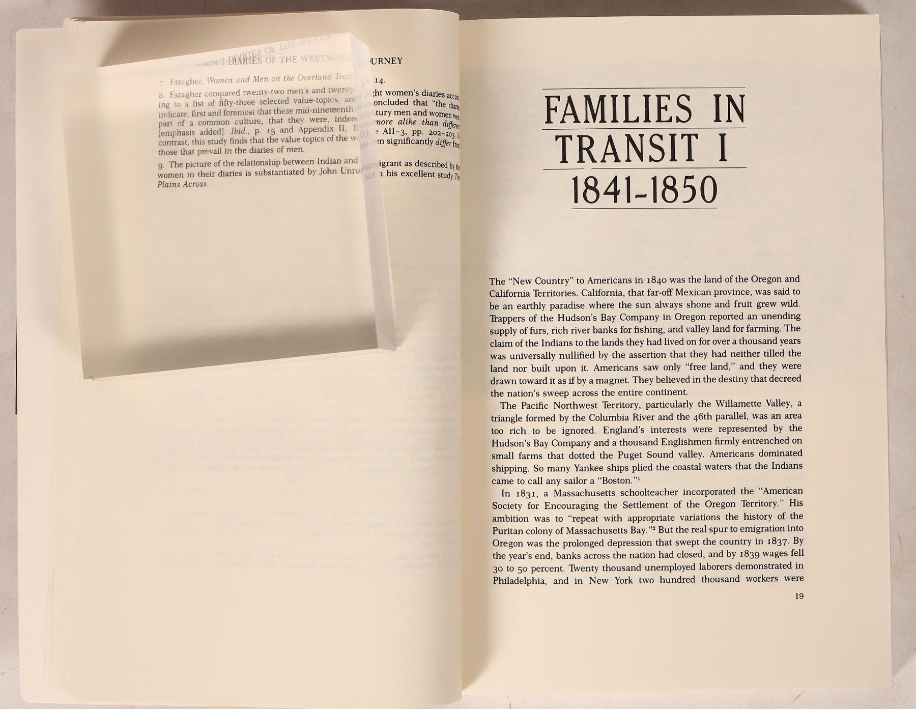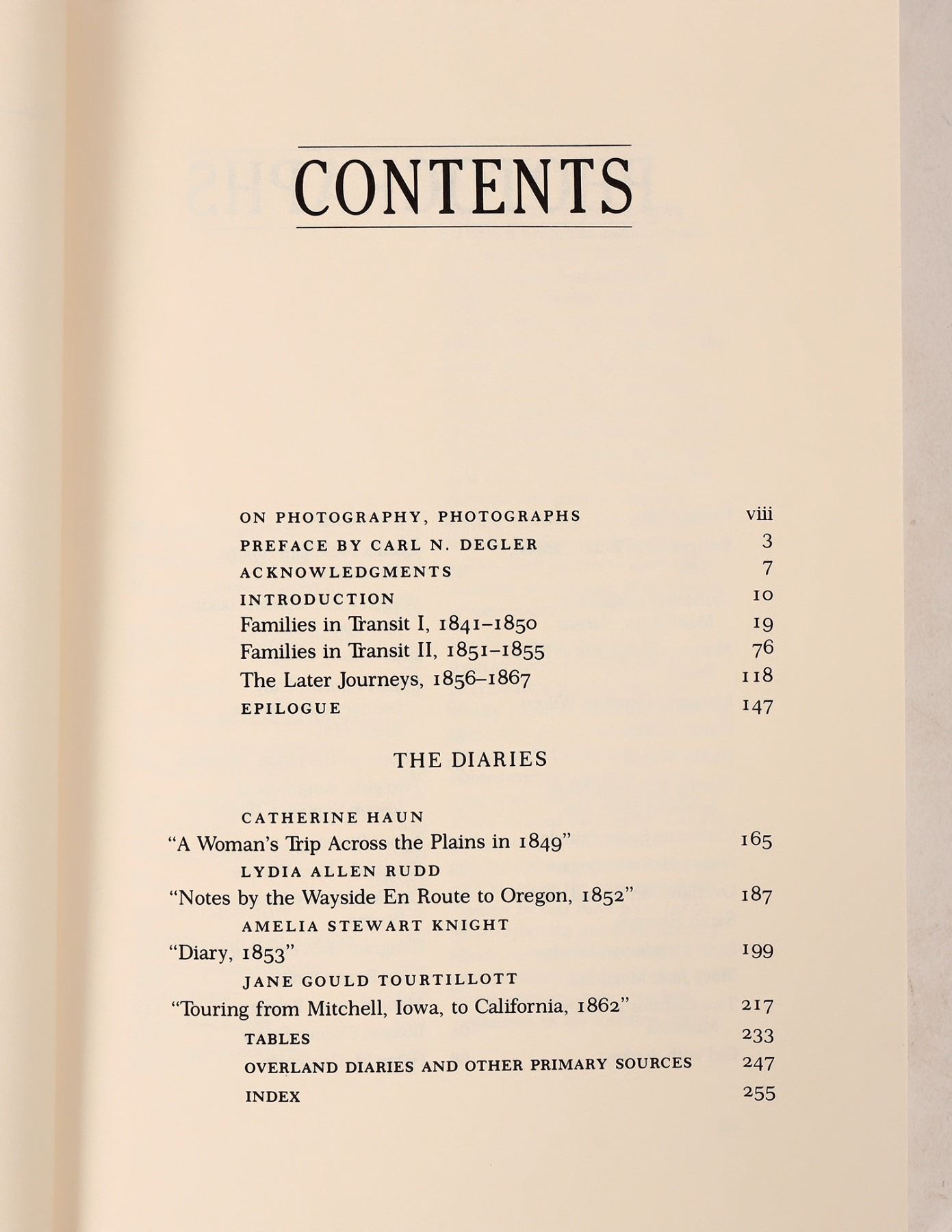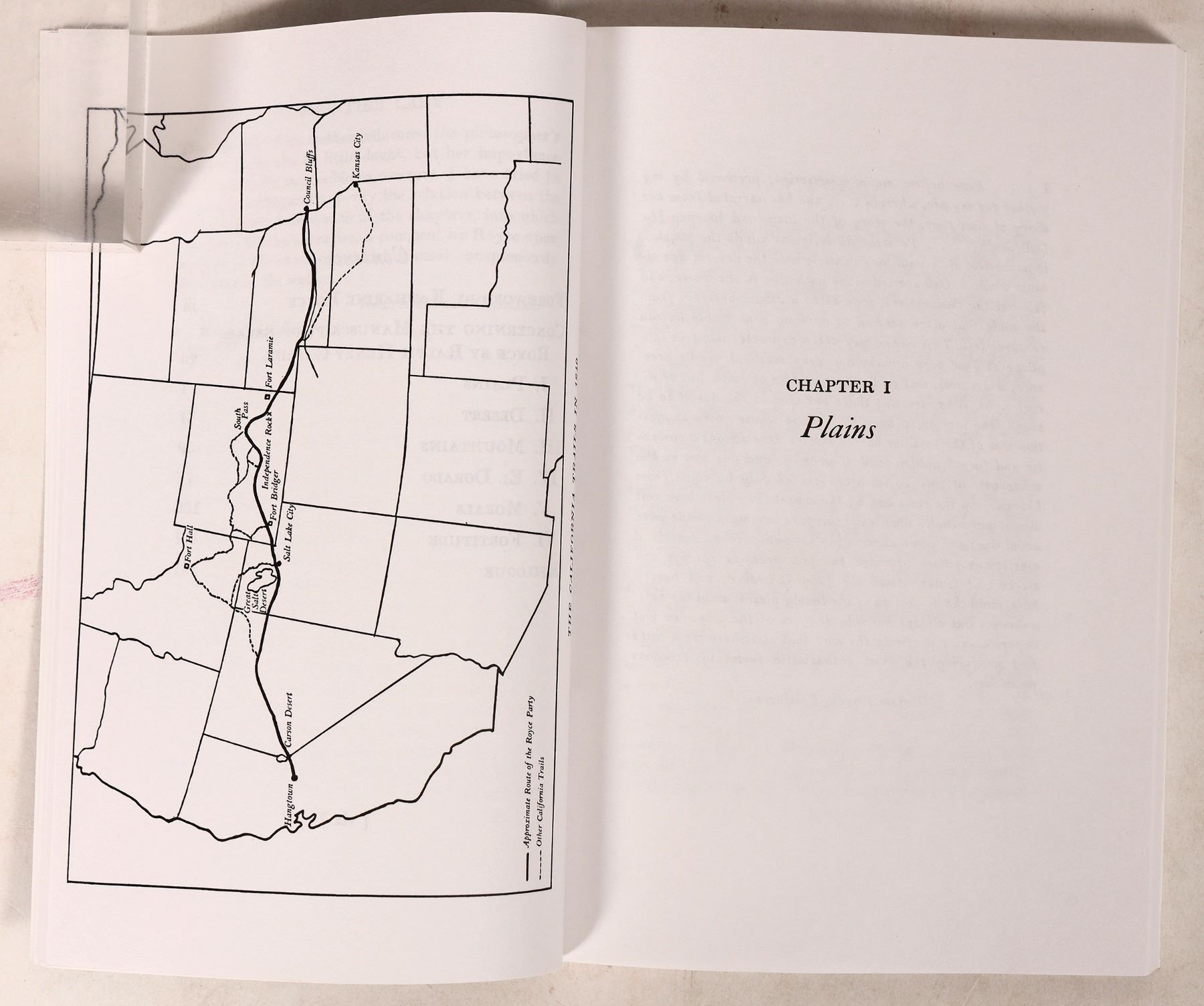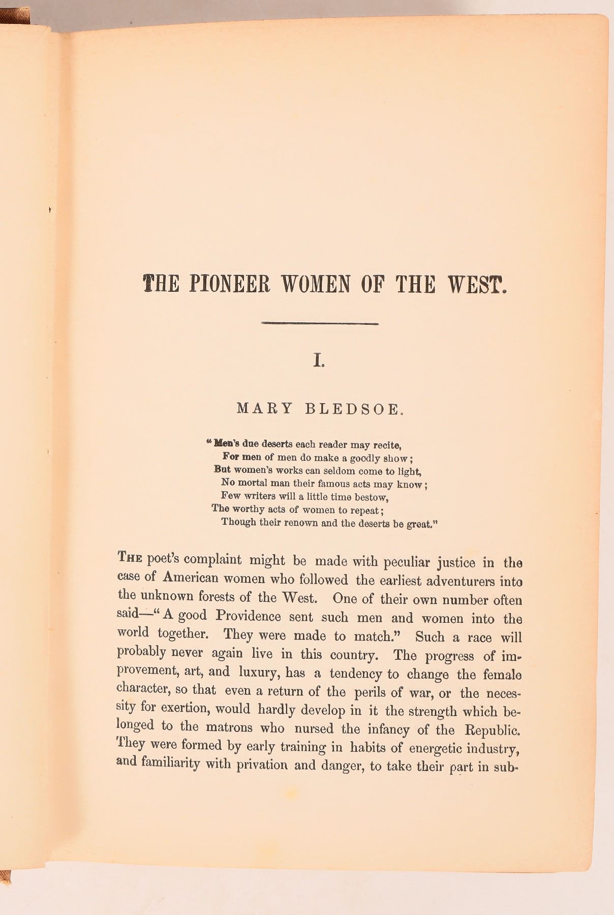 A small library of eight books about pioneer women in the West. Includes: The Pioneer Women of the West, Mrs. Elizabeth F. Ellet, author of "The Queens of American Society," and "The Women of the American Revolution," etc., late 1800s, 5x7.5", 434 pp., fly leaf page and front board detached, foxing, spine slightly worn at top and bottom and corners at bottom; A Summer in a Canyon: A California Story, Kate Douglas Wiggin, first edition, 1889, fictional story takes place in Canyon Las Flores, 5x7", 272 pp., light foxing, light wear spine edges; Life and Letters of A Forty-Niner's Daughter, Aurora Esmeralda (Ella Sterling Mighels), introduction to the Story of the Descendent of Sterling B.F. Clark, first printing, 550/1600, 1929, 6.5x9", 371 pp., slight wear upper and lower front corners; Apron Full of Gold, the letters of Mary Jane Megquier from San Francisco, 1849-1856, Editor Robert Glass Cleland, 1949, 6x9", 99 pp., dust jacket, fine; West Coast Journeys 1865-1879, the Travelogue of a Remarkable Woman, Caroline C. Leighton, 1995, 5.5x8.5", paperback, 166 pp., very good; Women's Diaries of the Westward Journey, Lillian Schlissel, 1982, 6x9", paperback, 262 pp., very good; Ho for California!, Women's Overland Diaries from the Huntington Library, edited and annotated by Sandra L. Myres, 1980, 6x9", paperback, 314 pp., very good; A Frontier Lady, Recollections of the Gold Rush and Early California, Sarah Royce, 1977, 5x8", paperback, 140 pp., fine; A Woman's Overland Journal to California, Mary Rockwood Powers, 1985, author died in 1858, her journal first appeared in Amateur Book Collector/American Book Collector, Vol. I, Nos. 1-5, September 1950, 6x9", 73 pp., fine.