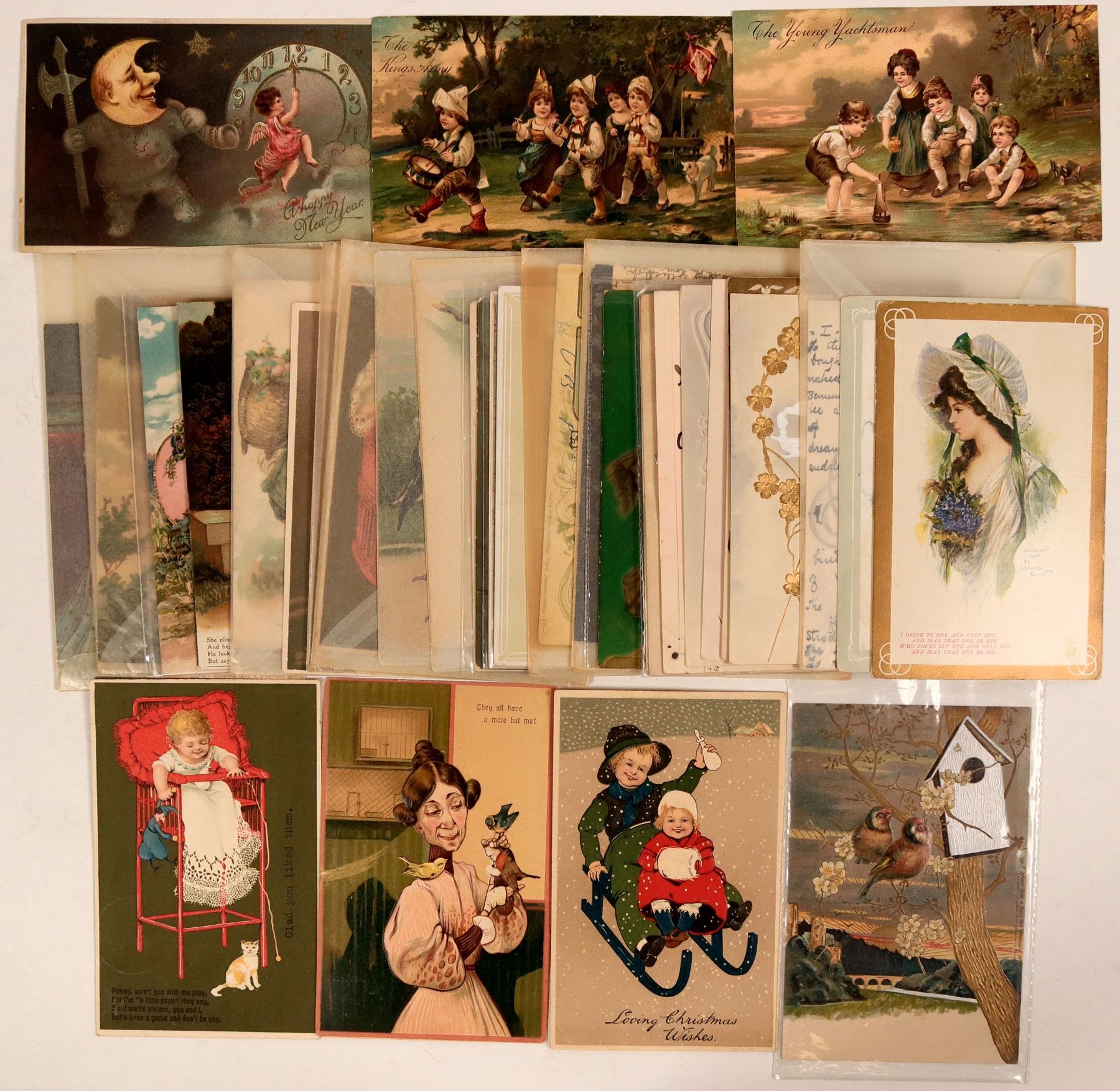 Large lot of postcards featuring women and women's poetry. Includes one Tuck card art series #3481 with birds in a tree. Includes one women's poetry card signed by Archie Gunn, 1908. Also includes one women's poetry card signed by A. Heinze, 1908. See photos for the beautful artwork with relief on some cards.