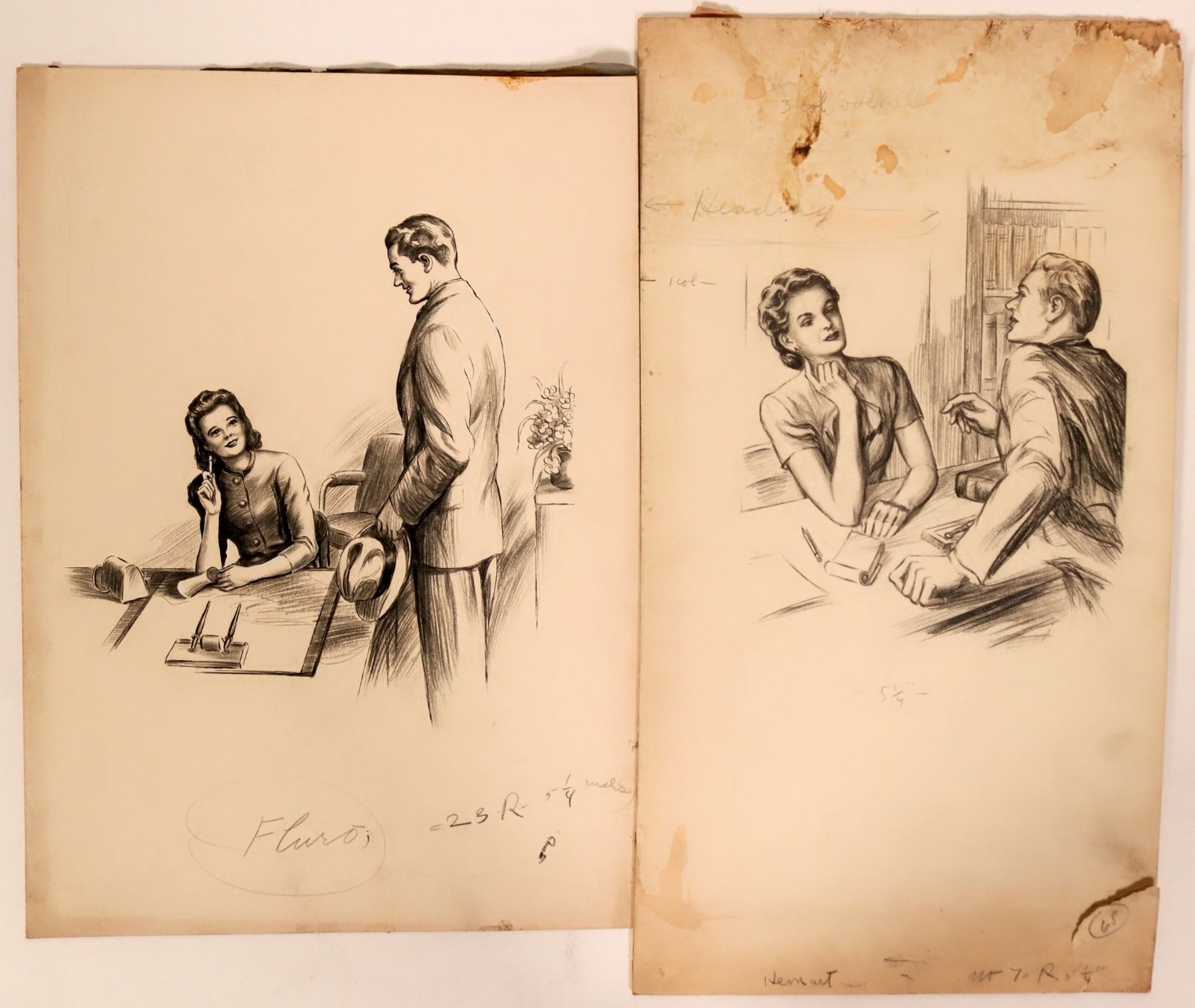 1) Woman secretary listening to man, pencil. 9.5" x 7.5". 2) Pencil drawing of man chatting up woman at desk, 10" x 10".