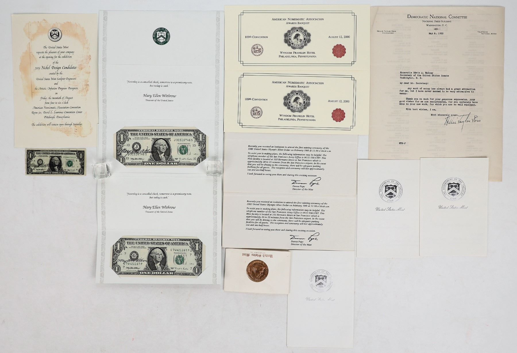 A collection of documents from the women of the United States Mint. 1) May 8, 1933 typewritten letter to Edwin A. Halsey Secretary of the United States Senate from Nellie Taylor Ross, five days after Franklin Delano Roosevelt appointed her the first woman Mint Director. 2) three invitations from Donna Pope, Director of the Mint, to the first minting of the 1983 U. S. Olympic Silver Dollar Coin at the San Francisco Assay Office. 3) Donna Pope autographed Ronald Reagan bronze medal. 4) two crisp uncirculated $1 Federal Reserve Notes autographed by Mary Ellen Withrow, Treasurer of the United States. "Yesterday is a cancelled check, tomorrow is a promissory note, but today is cash."
