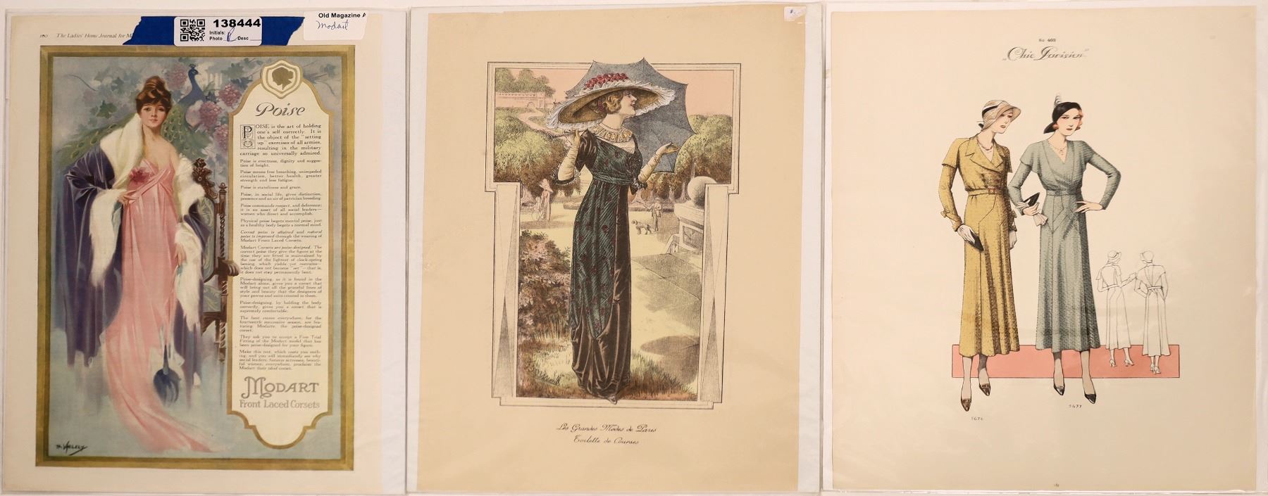 This lot has three advertisements for women's fashions from 1900 to the 1920's. First is "Les Grandes Modes de Paris Corlette de Courses" about 1900. A beautiful art deco print on quality paper; "Chic Parisian No. 403; and "Poise" from the Ladies Home Journal 1918. Poise is an advertisement from Modart detailing the comfort of wearing a quality corset promoting good posture and poise. All are in great condition worth framing.
