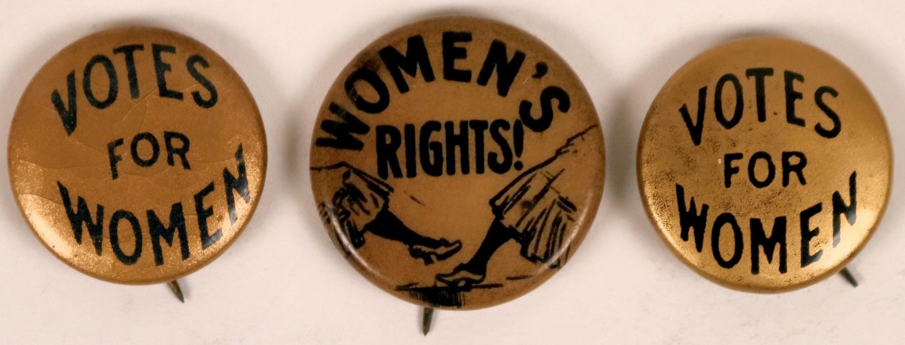 Three approximately 3/4 inch pinbacks promoting Women's Rights. Two with gold background read, "VOTES FOR WOMEN." The third with a background yellowed with age reads, "WOMEN'S RIGHTS!" It has prints of two women's legs with heels and long skirts jutting in from the sides. The back has an advertisement for Hassan Cigarettes. See photos for more details.