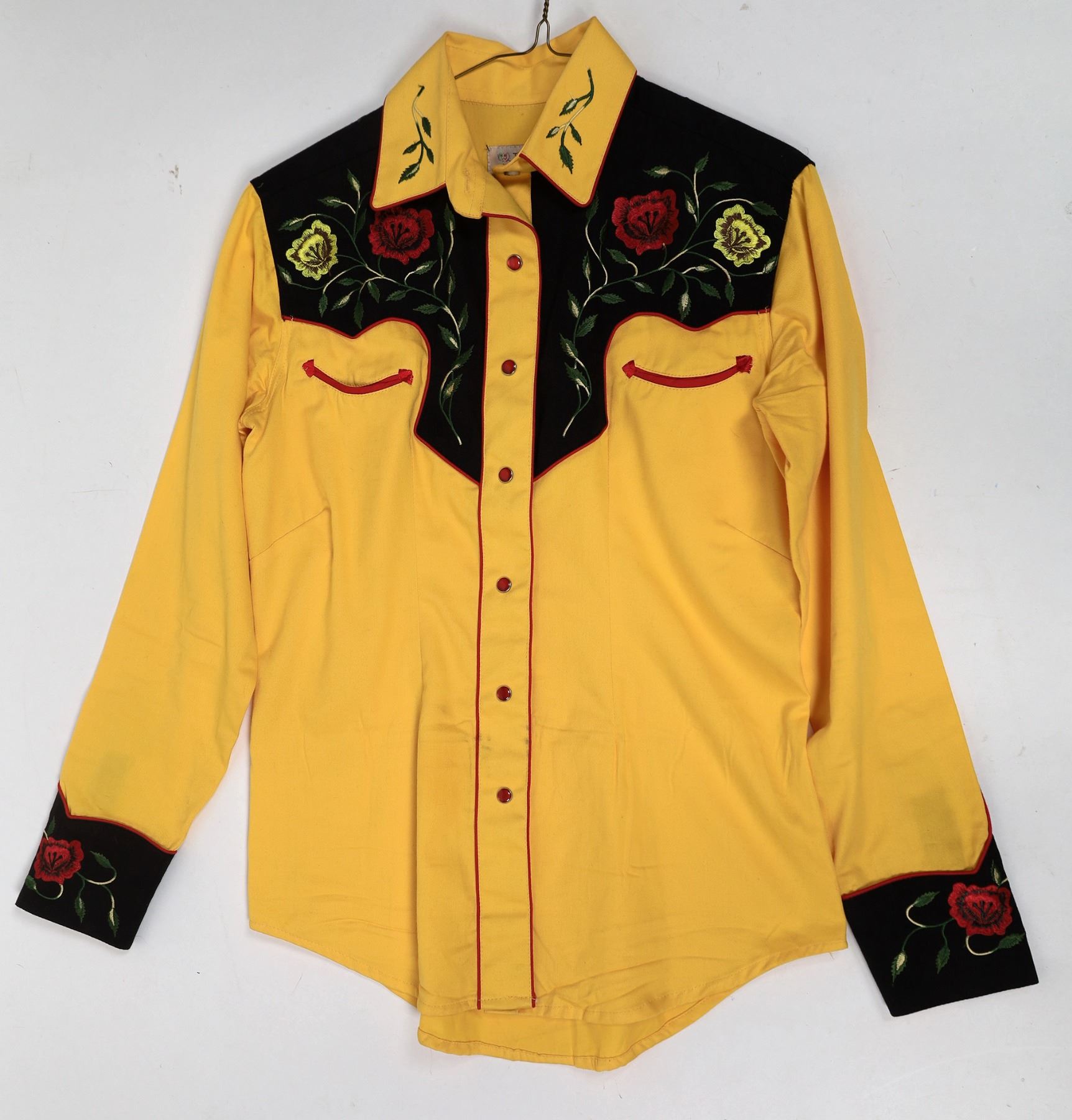 Lot of four womens western style shirts 1.) Yellow and black floral western shirt, size small, Tru West Rockmount Ranch Wear Denver Colo. 2.) White and blue floral, size medium, Tru West Rockmount 3.) Salmon/Brick with embroidery, size large, RU Cowgirl brand 4.) White Warner Brothers from Warner Brothers Studio Store 1996, size small. All in very good preowned condition.