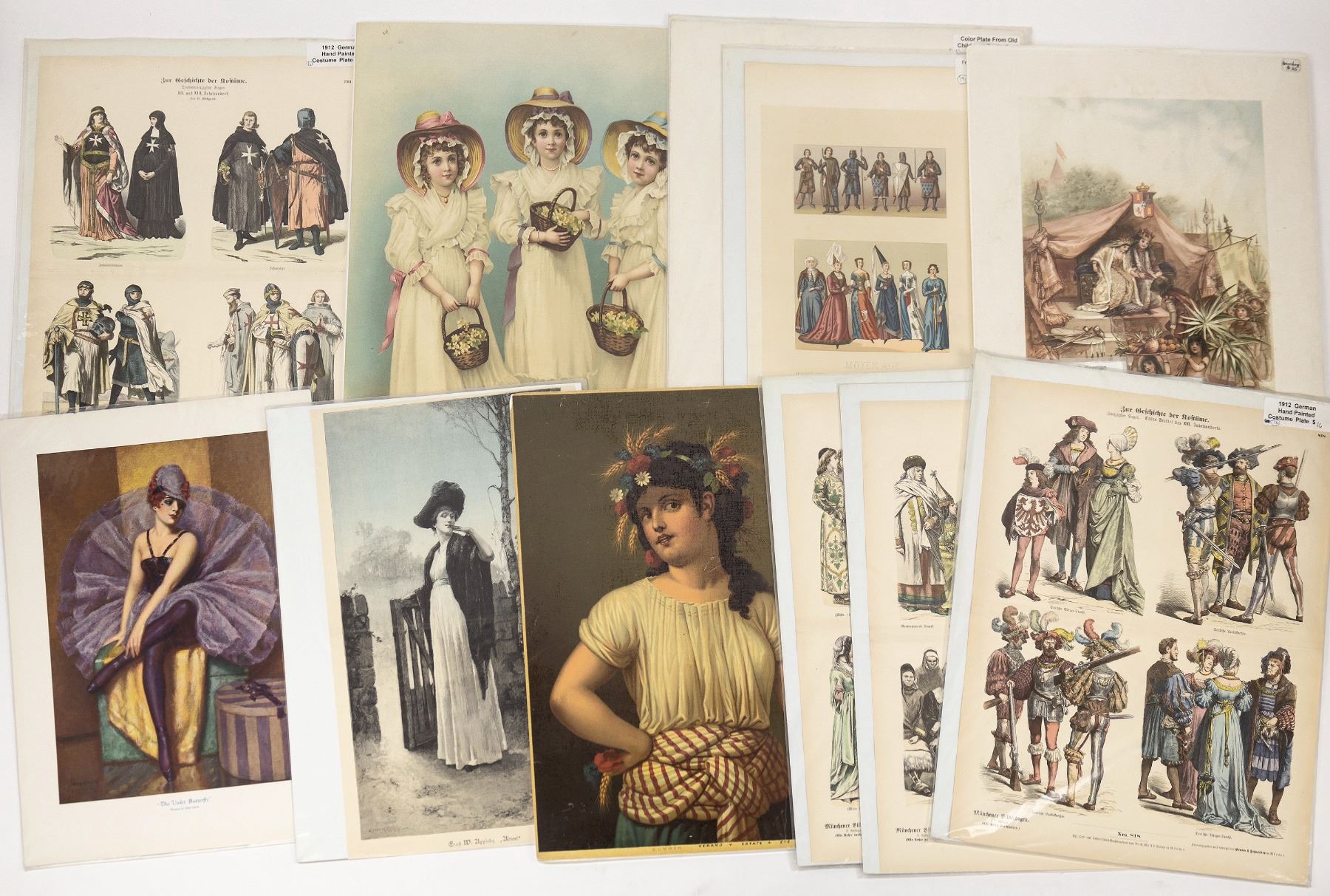 11 fashion prints. Lady with a Shawl, Violet Butterfly, Flowers in Hair, 3 girls, Royalty, Middle Ages-has toning, 4 German, Natives-has toning. Various sizes, around 16x12".