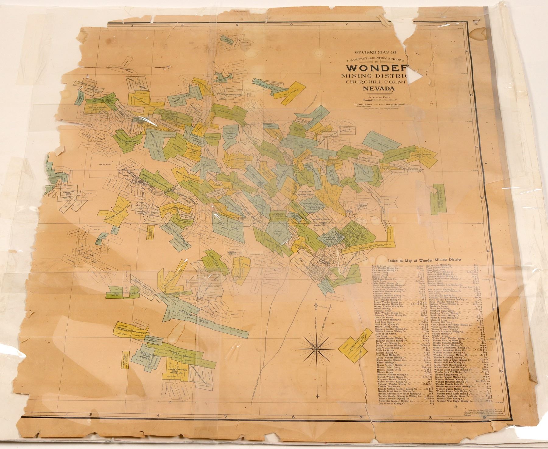 Map of Wonder, NV. Shows Wonder town sites: Hercules and Red Top. Has all surveyed claims. Colored by mining company ownership, indexed at lower right. Tears, missing sections and water stain. Still a nice historical map. Please inspect.