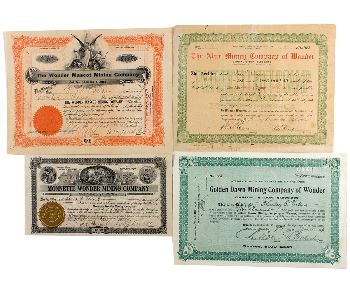 Lot of 4. 1) The Wonder Mascot Mining Company. Incorporated under the laws of Arizona, 1906. #27. Issued for 25,000 shares to G.K. Preston on Mar. 16, 1908. Signed by R. W. Farmington (?) (president) and secretary. Reverse not endorsed. Orange border and seal. Vignette of angelic woman with man and woman sitting beside her. Toning. Pinhole at top center and bottom left. Mild soiling right edge. 2) Golden Dawn Mining Company of Wonder. Incorporated under the laws of the state of Maine. #883. Issued for 2000 shares to Charles E. Perkins on June 9th, 1909. Signed by Whicker (?) (president) and Ball (secretary). Not endorsed on back. Green border and background. Printed by American Bank Note Co., New York, Litho. Soiling on right front and fold line. Very rare. First one seen by our company. 3) The Alice Mining Company of Wonder. Inc. under the laws of Nevada, October, 1906. #976. Issued for 500 shares to Chas. V. Byrns on Nov. 23rd, 1906. Signed by Comp (president) and Darren (secretary). Printed by Nevada Press, Carson City. Green border with red and black print. Heavy toning and soiling as well as pinholes and a tear in upper right corner. Folds. Poor condition, but scarce company. 4) Monnette Wonder Mining Company. Inc. under the laws of the state of Nevada. Mines: Wonder Mining District, Churchill Co., Nevada. Transfer Office: Goldfield, Nev. #138. Uncancelled. Issued for 500 shares to Louis S. Clark on May 27th, 1907. Signed by Monnete (president) and Wheeler (secretary). Endorsed on back. Three vignette of mining scenes along the top. Printed by Nevada Press, Carson City. Folds, otherwise nice condition.City: WonderCounty: ChurchillState: NVDate: 1906-1909