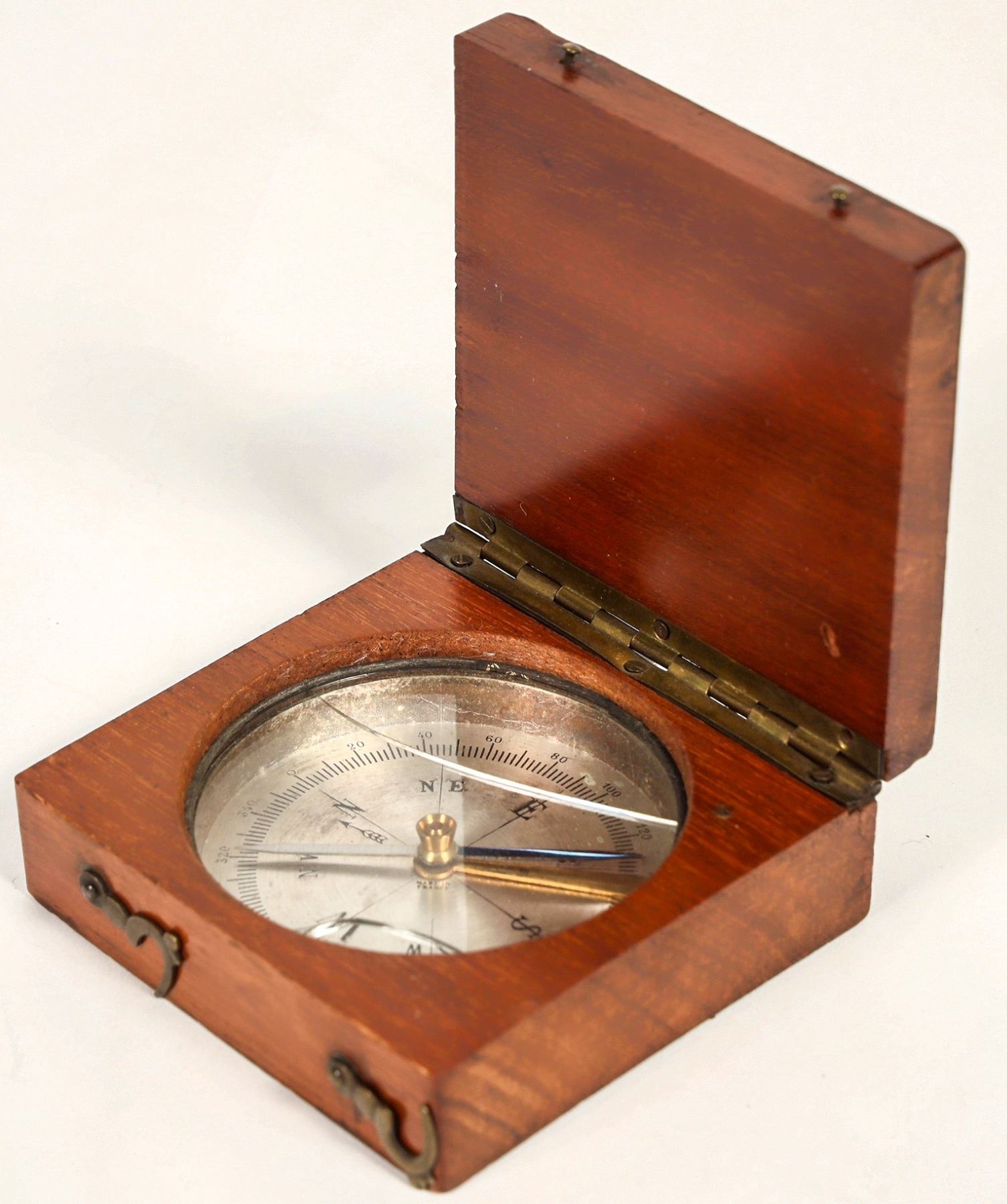 This wood box compass was made in France about 1910, no makers mark. The box is mahogany with a piano hinge. The glass lens is broken and the needle is not in working order. The card has light scuffing. Please see photo for details. 3 ibn. X 3 in. Hooks are in place. Please see photo for details.