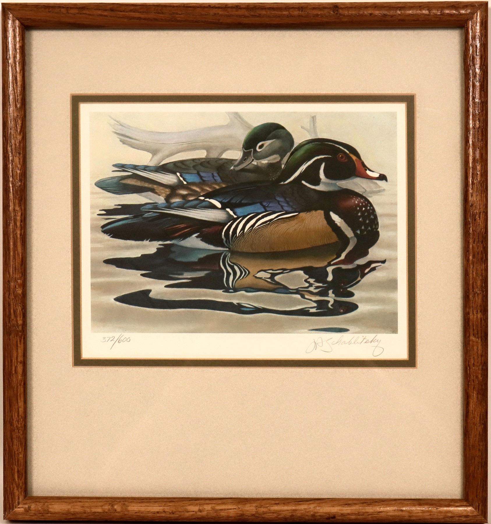 Beautiful watercolor print of Wood ducks by J. Schablitsky. He was a life-long watercolorist of a variety of wildlife subjects. This is a signed giclee print numbered 372/600. Double matted and framed: 15" x 14".