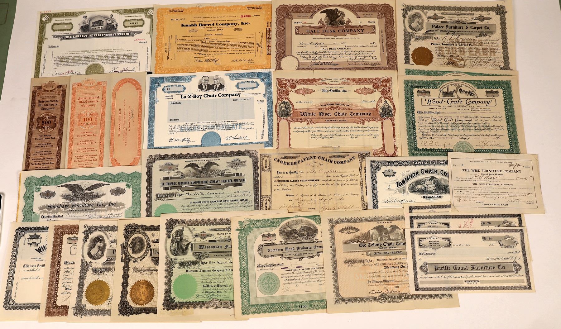 23 stock certificates issued by various and sundry furniture and wood companies and manufacturers. Some are blank, some are specimens. Issuing companies include White River Chair Company, Toward Chair Company, Wood-Craft Company, Wisconsin Furniture Company, The Wise Furniture Company and La-Z-Boy Chair Company. Please see photos for more details.