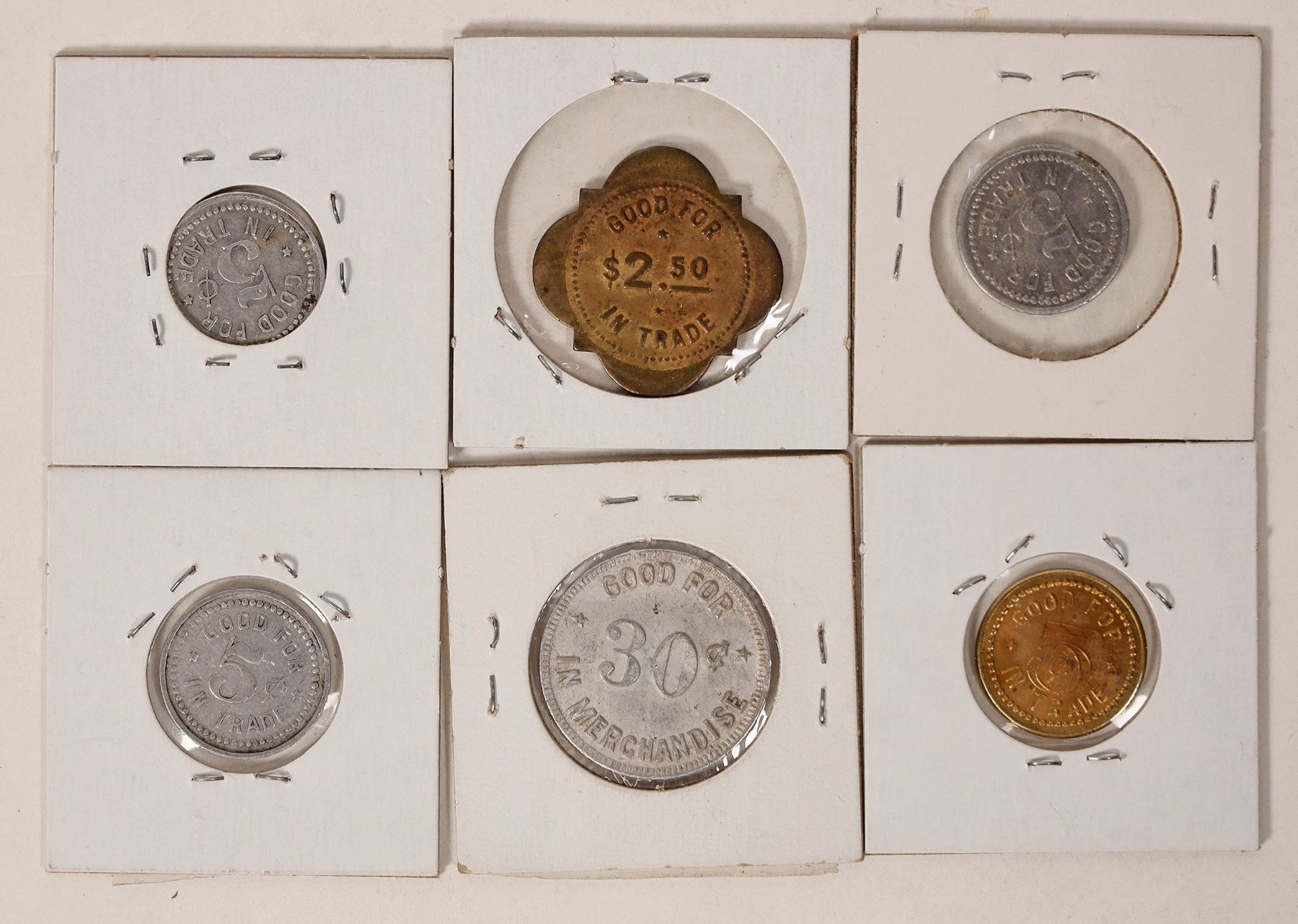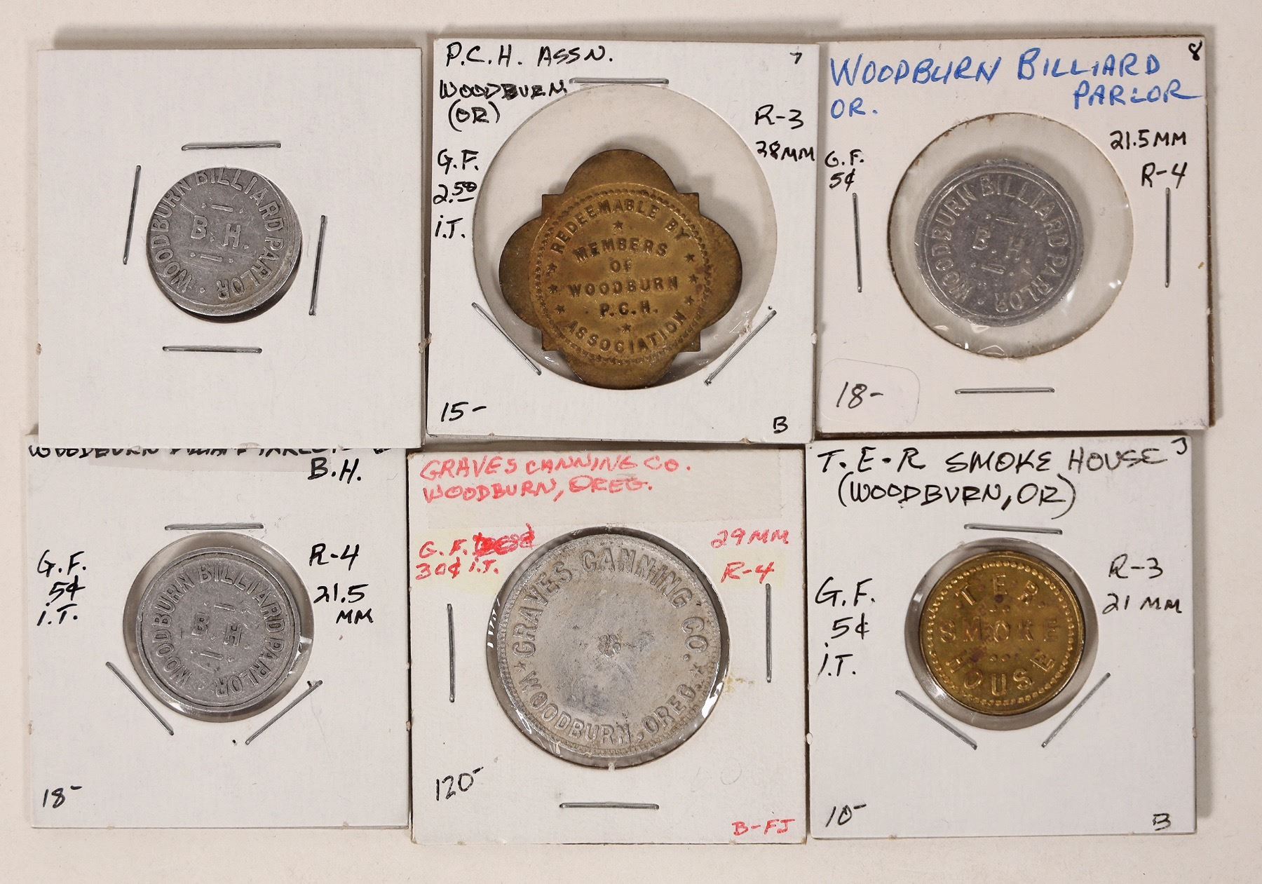 Lot of six tokens from Woodburn: Graves Canning Co.; Woodburn Billiard Parlor (3); T. E. R. Smoke House; P. C. H. Assn.[ Woodburn Oregon