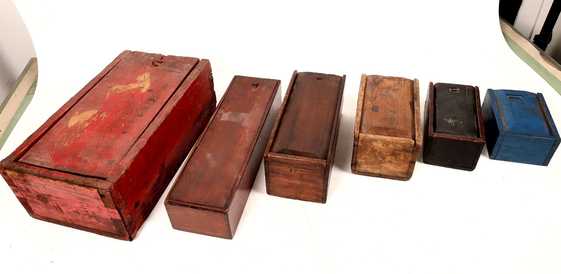 Six vintage wooden boxes, thought to be for keeping hardware such as drills and various equipment or parts. All have sliding lids. No labels found on any of them. 1) Red, 16 x 9 x 6 inches. 2) Black, 7 1/2 x 4 x 3 1/2 inches. 3) Blue, 6 x 4 1/2 x 3 inches (written under the lid: "D. G. Hewitt / His Box Jan / 1899".4) Brown stained, 11 x 5 x 5 inches.5) Unfinished 8 1/2 x 5 x 4 1/2 inches.6) Brown stained, 15 1/2 x 4 1/2 x 3 1/2 inches. Gary Bracken Collection