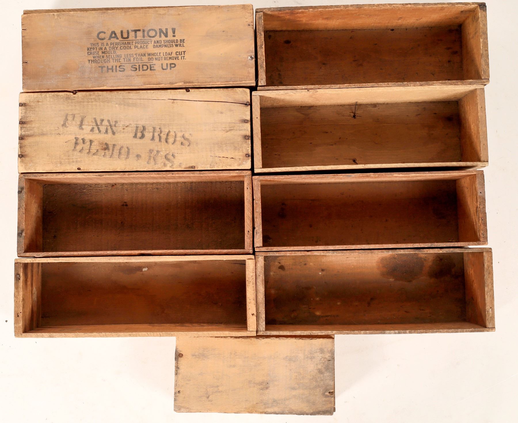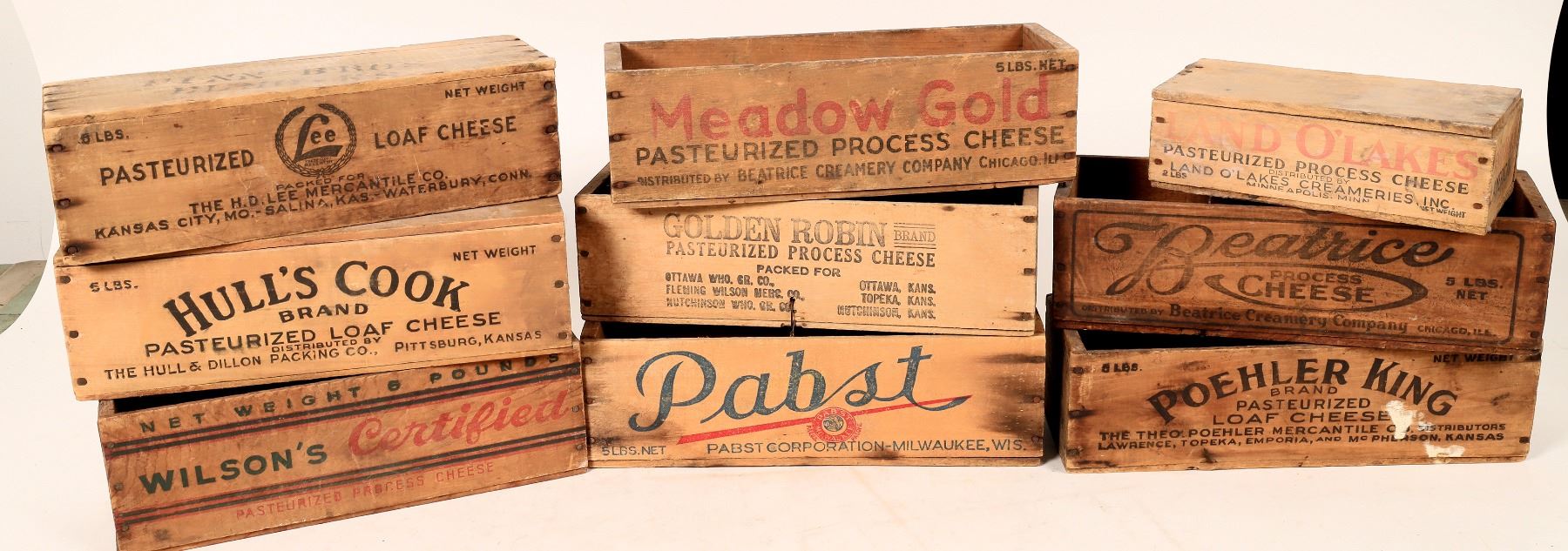 9 different wooden cheese boxes, about 3.5x12x4". Hull's Cook, Wilson's, Land O' Lakes, Poehler King, Meadow Gold, Pabst, Golden Robin etc. Gary Bracken Collection