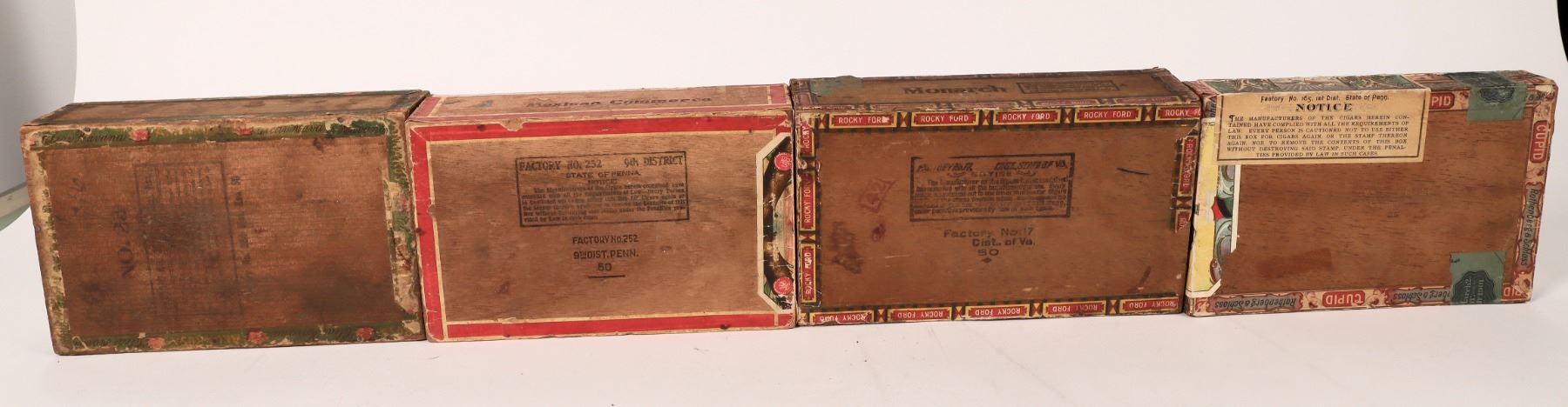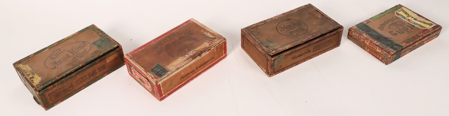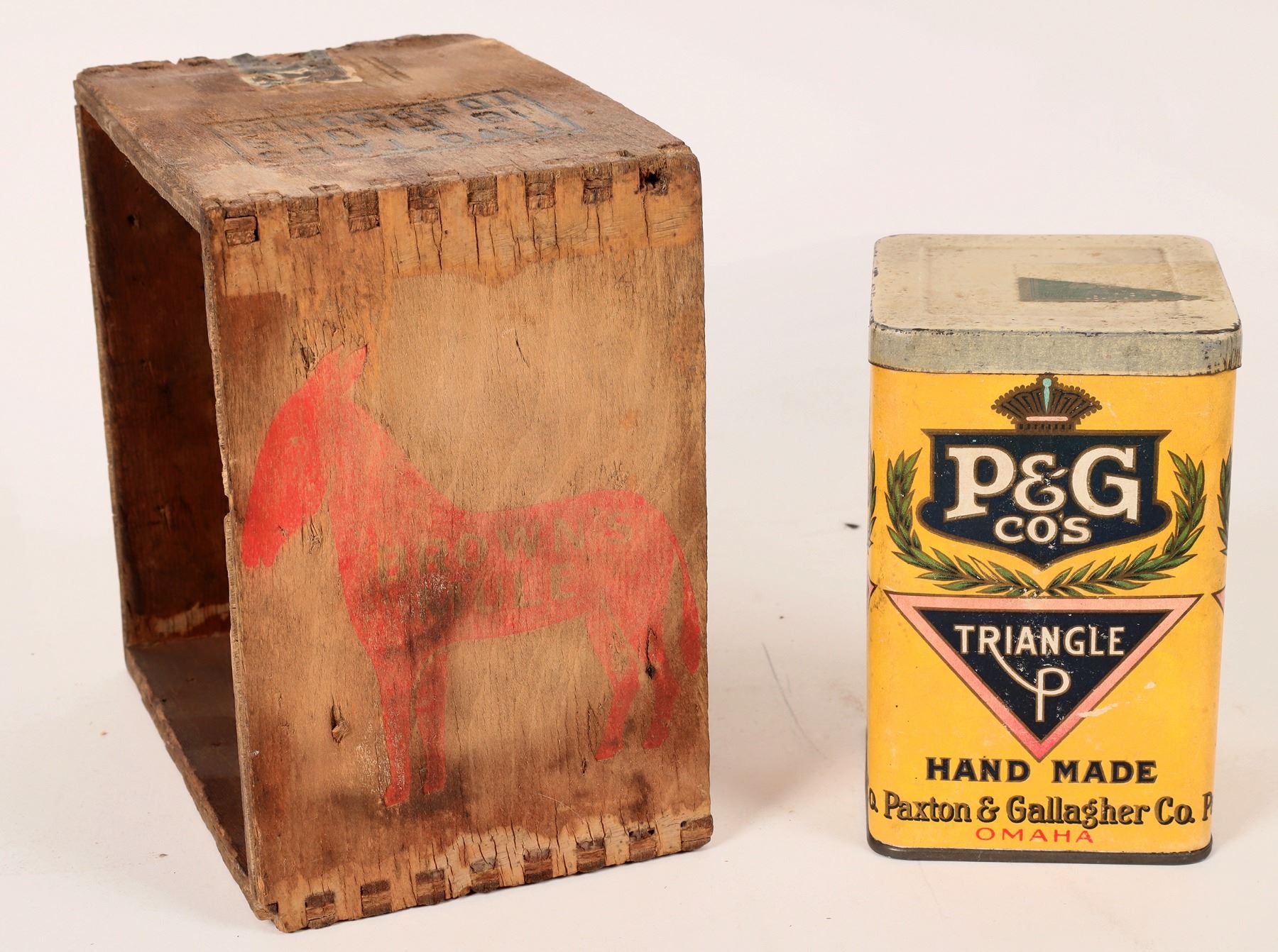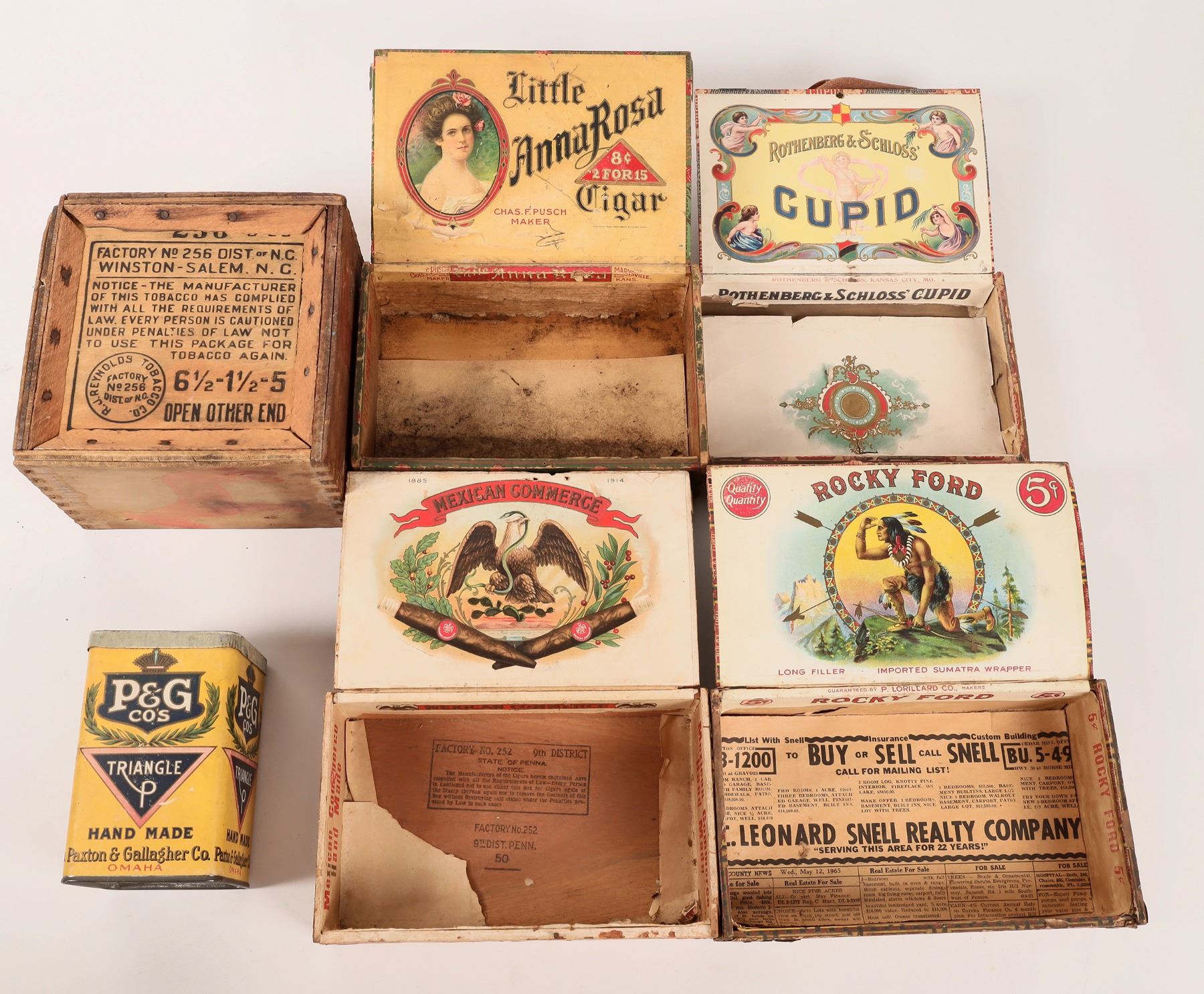 Five wooden cigar boxes and a tobacco tin. The tin is P & G Co.'s Triangle P made at factory #990 in Michigan, sold by Paxton & Gallagher of Omaha. Tin is 3 1/4 inches square and 5 1/2 inches tall. The cigar boxes: 1) Rocky Ford, with Indian vignette inside cover and end panels. Made by P. Lorillard Co at factory #17 in Virginia. 2) Rothenberg & Schloss' Cupid; factory #165 in Pennsylvania; sold by Rothenberg & Schloss of Kansas City. 3) Little Anna Rosa Cigars, made at factory #23, Kansas, sold by Chas. F. Pusch, Marysville, Kansas. 4) Mexican Commerce, factory #252 Pennsylvania, sold by Ed Haas Neosha, Missouri. 5) R. J. Reynolds Tobacco Co., factory #256 North Carolina, 7 x 7 x 4 1/2 inches, no top.