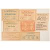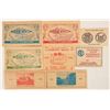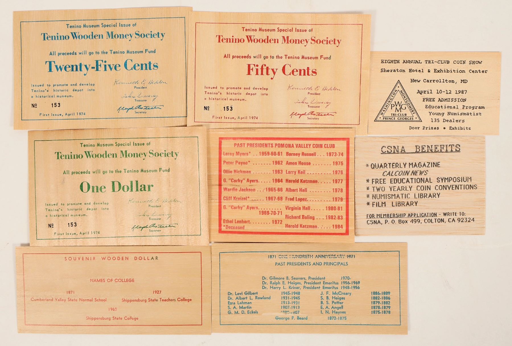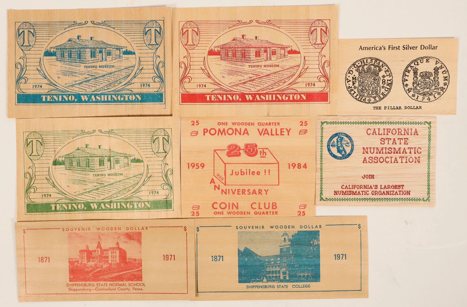 Collection of 8 wooden currency bills, c1970s-80s. Bills printed with organizations' information on fronts and backs. Sizes range from 4" to 6"w by 2.5" to 3.5"h. Includes: Tenino (Washington) Wooden Money Society (3 different), California State Numismatic Association, Shippensburg (Pennsylvania) State Normal School (2 different), Pomona Valley Coin Club, and Washington Montgomery Prince Georges Tri-Club coin show.