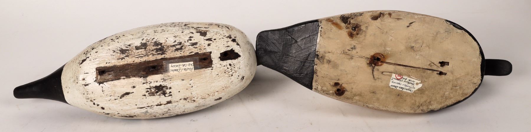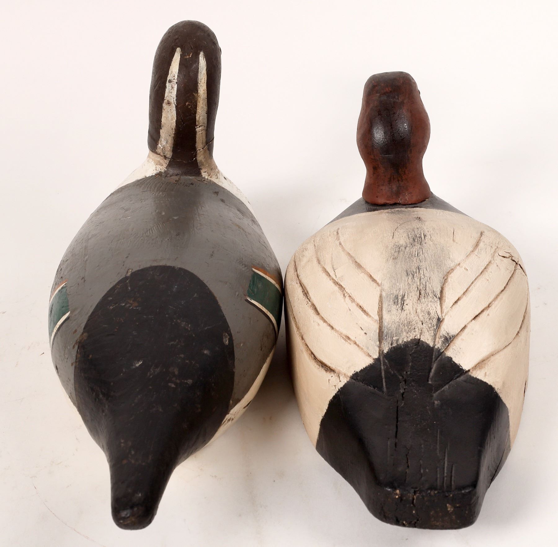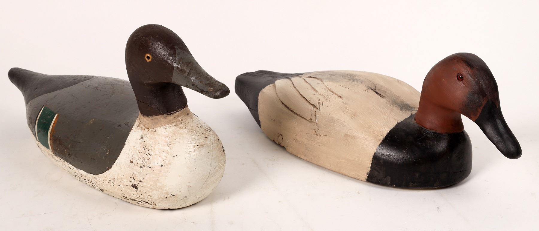 2 wooden drake duck decoys. White body canvasback drake with feather carving, Northern Vermont origin. 5.5x12.5", top cracks, bottom chip. Pintail Drake, California origin, 6.5x14.5", neck crack, body wear. Geff Pollock Collection