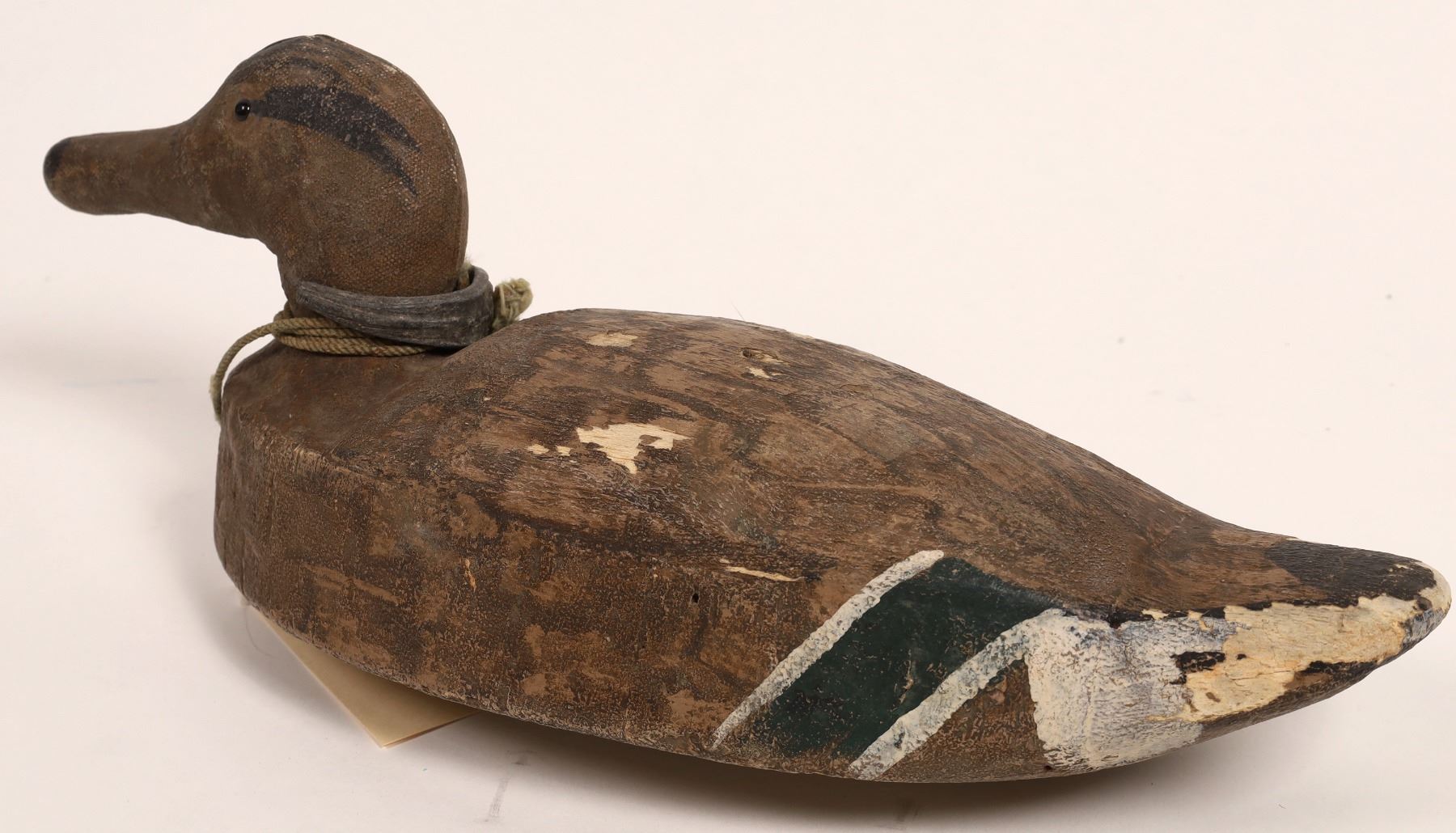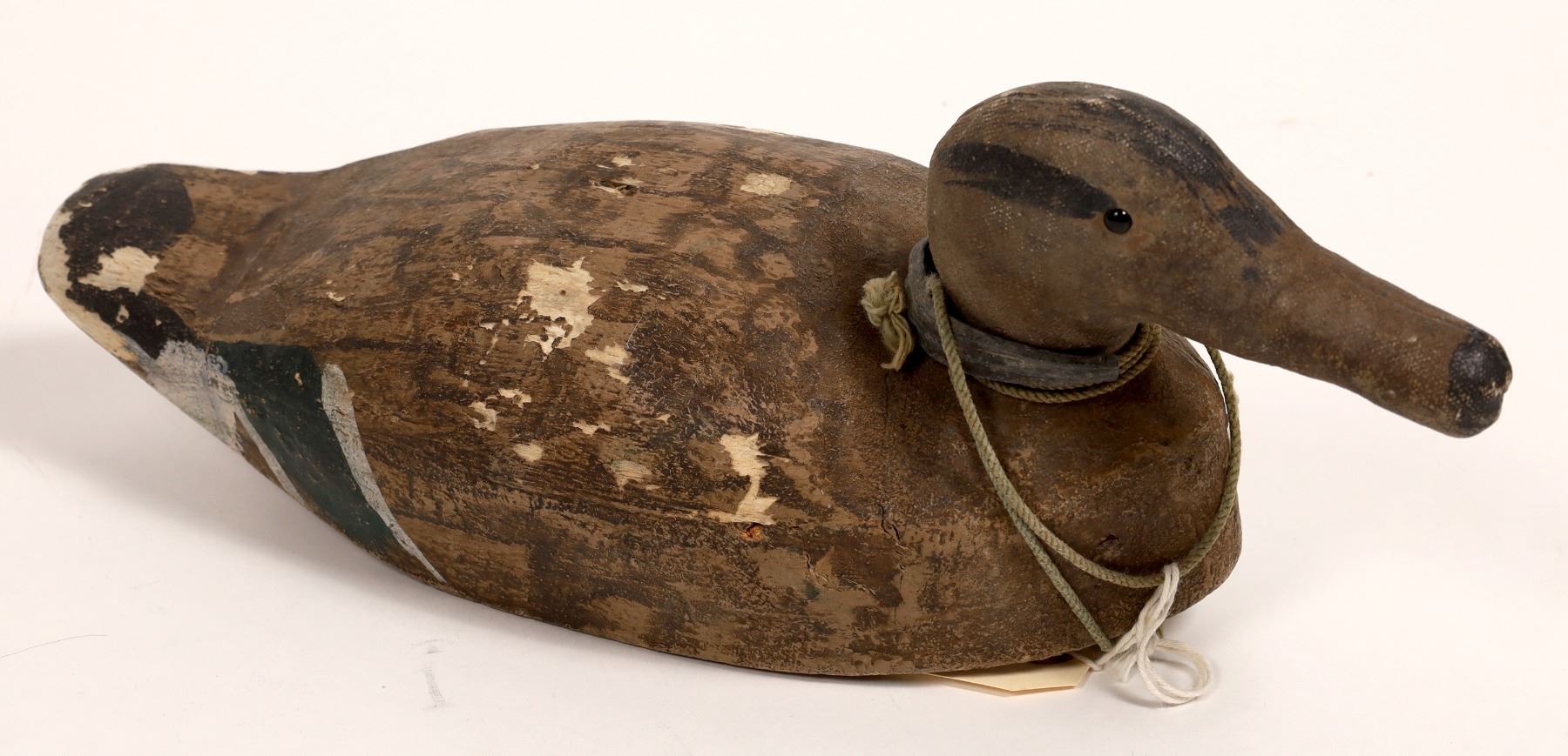 Wooden decoy painted to resemble a female mallard duck -- c'mon fellas, land over here, I'm lonely! Owner's family is said to have used this in the area around Cherry Creek, Nevada, between Wells and Ely. Dimensions are approx. 14 x 5 x 5 inches, and it weighs about 1 pound.