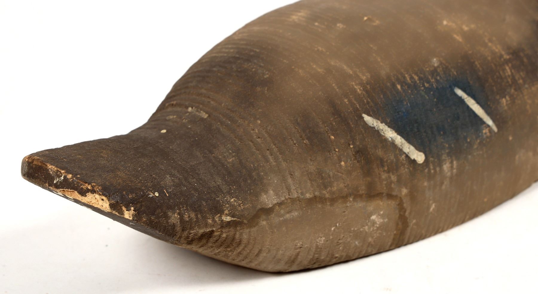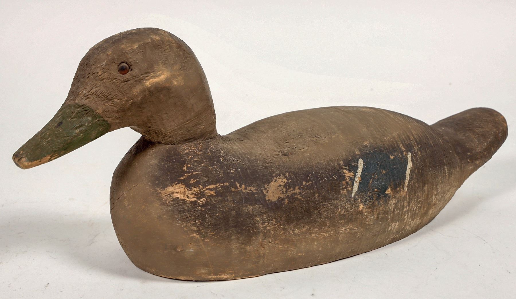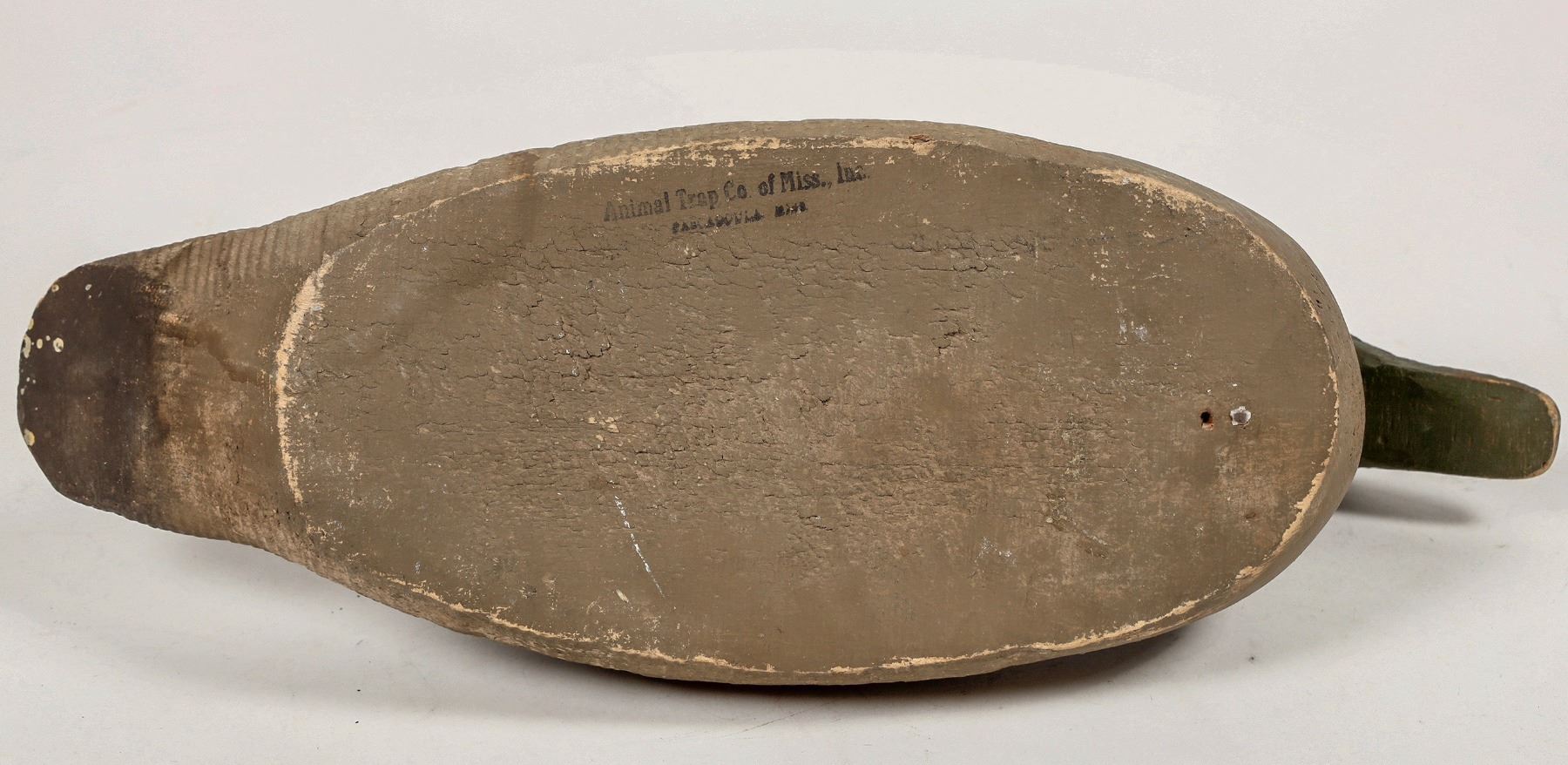 Stamped on the bottom "Animal Trap Co. of Miss., Inc." This was a significant player in the decoy manufacturing industry. Likely pre-1950. 16 x 5 x 7" Originally, the Animal Trap Company of North America focused on producing animal traps. In 1918 they expanded into making wooden hunting decoys. Their decoys were crafted using duplicating lathe machines, ensuring mass production with consistent quality. Pascagoula became known as the home of numerous carvers of decoys. Over the years Animal Trap Co. bought out most of the home-town competitors. The company produced various decoy models, including wooden and paper-mâché, and later plastic decoys. In about 1949 they ceased wooden decoy production, shifting focus to plastic models. The company eventually stopped manufacturing in the 1970s, largely due to the impact of Hurricane Agnes in 1972.