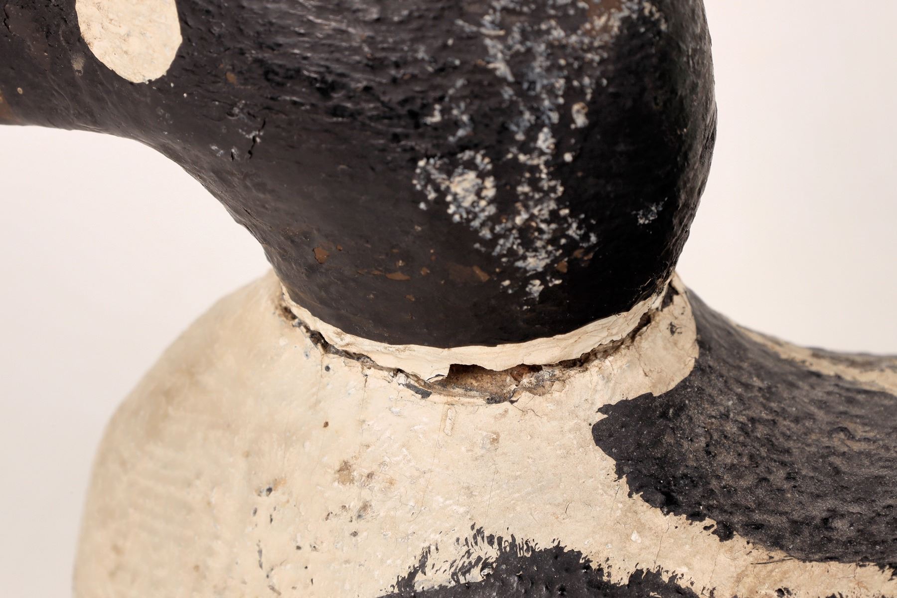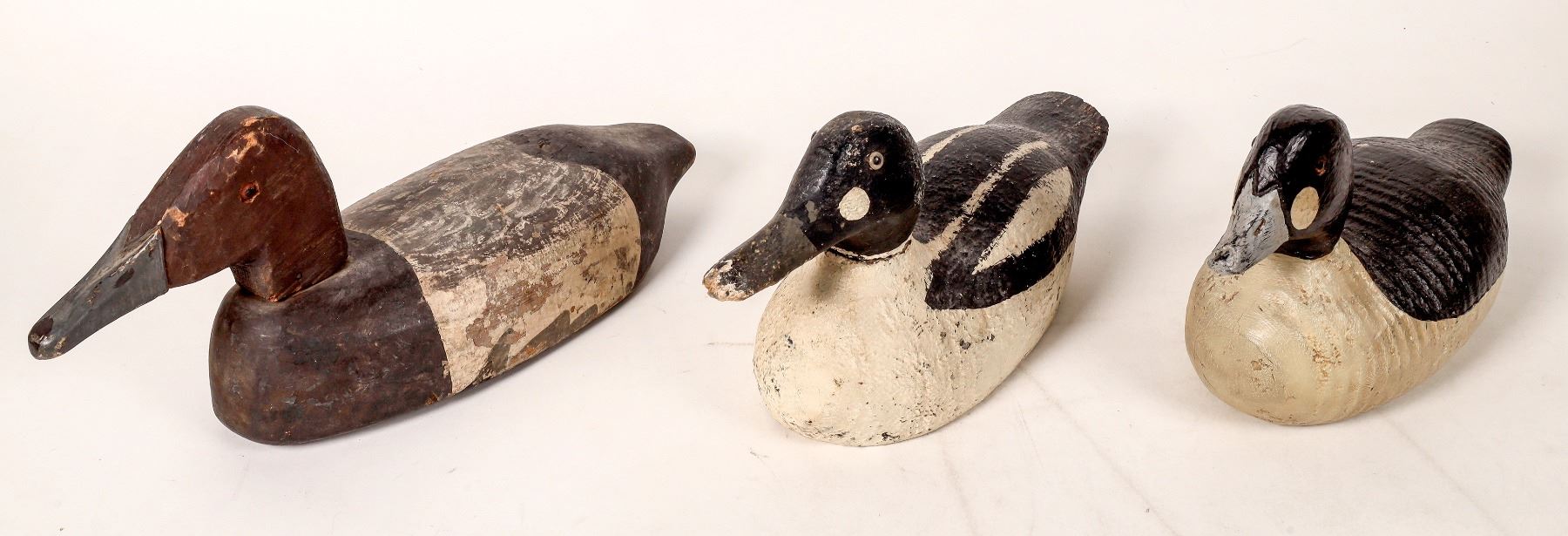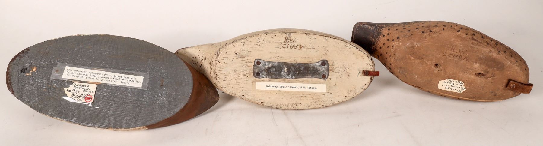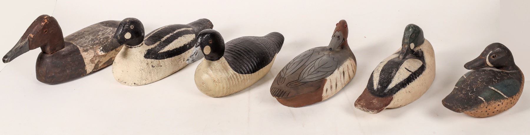 6 hand carved wooden duck decoys. Old weathered goldeneye drake, from northern Vermont, c. 1940's, 7x14", severed neck. Goldeneye Drake, stamped Victor, from Vermont or Maine, c. 1940'. Goldeneye Drake asleep, etched on bottom R W Chaap, 6x12.5". Old, unfloated, canvasback drake, turned head with carved feathers, c. 1940's from Quebec, Canada, nice condition, 5x13". Preening bluewing teal, R W Schaap, c. 1980's, Oregon origin, 5x11". Unknown species brown head with red eyes, 6.5x16", well used. Gary Bracken Collection