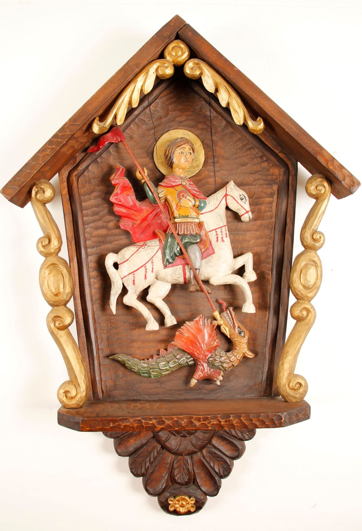 Folk Art of Greek influence, made of walnut(?). This is of St. George "St. George slays the dragon. Georgian Fresco". The legend of Saint George & the Dragon is first recorded in the 11th century, in a Georgian source. It reaches Europe in the 12th century. In The Golden Legend, by 13th-century Archbishop of Genoa Jacobus da Varagine, George's death is at the hands of Dacian, and about the year 287. Interesting lot. Good condition.18.5" x 27".