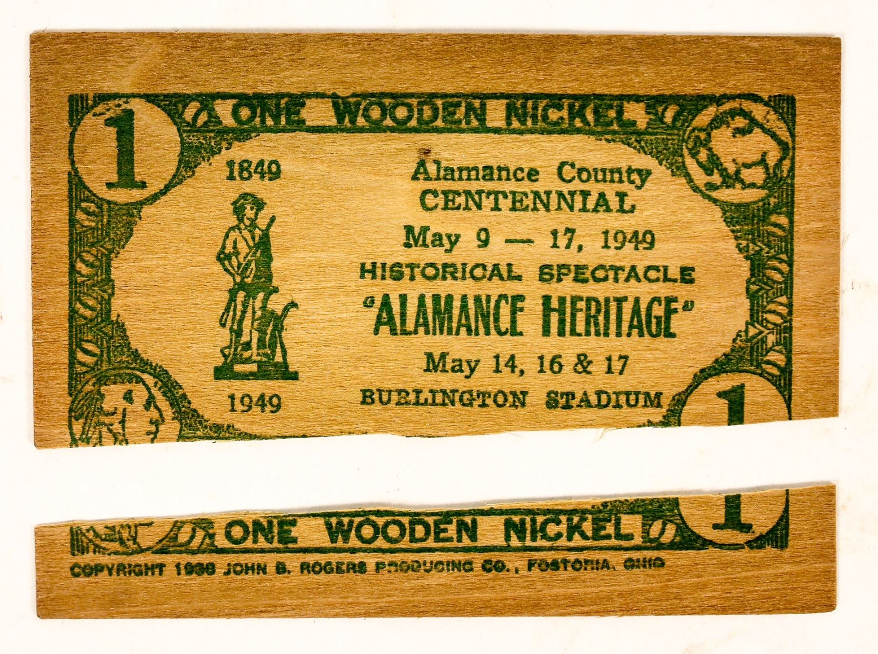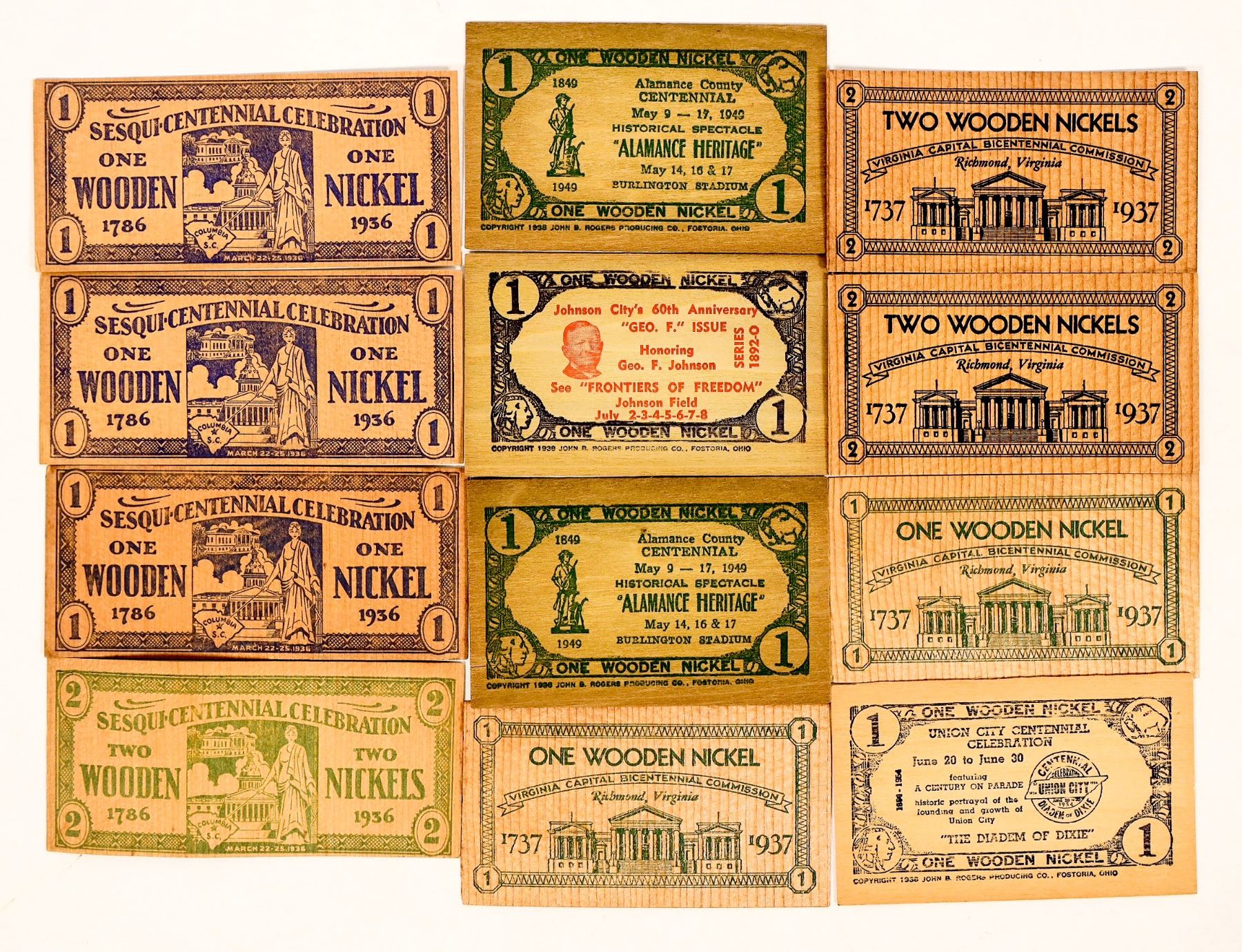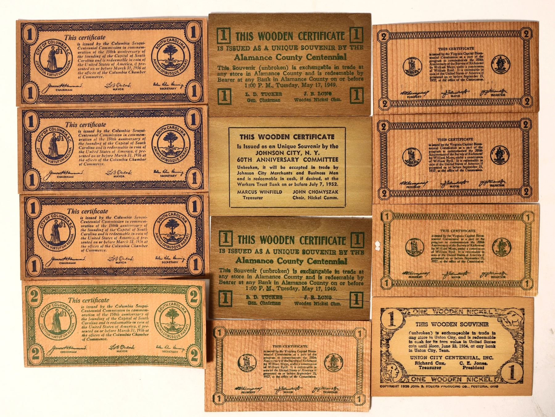 A dozen "one" and "two" wooden nickels, currency from eastern states, c1936-49. Includes: Columbia, South Carolina Sequi-centennial, c1936 (4); Richmond, Virginia Bi-centennial, c1937 (4); Alamance County, North Carolina, Centennial, c1949 (2); Union City, Tennessee, Centennial, c1954; Johnson City, N.Y., 60th Anniversary, c1952.