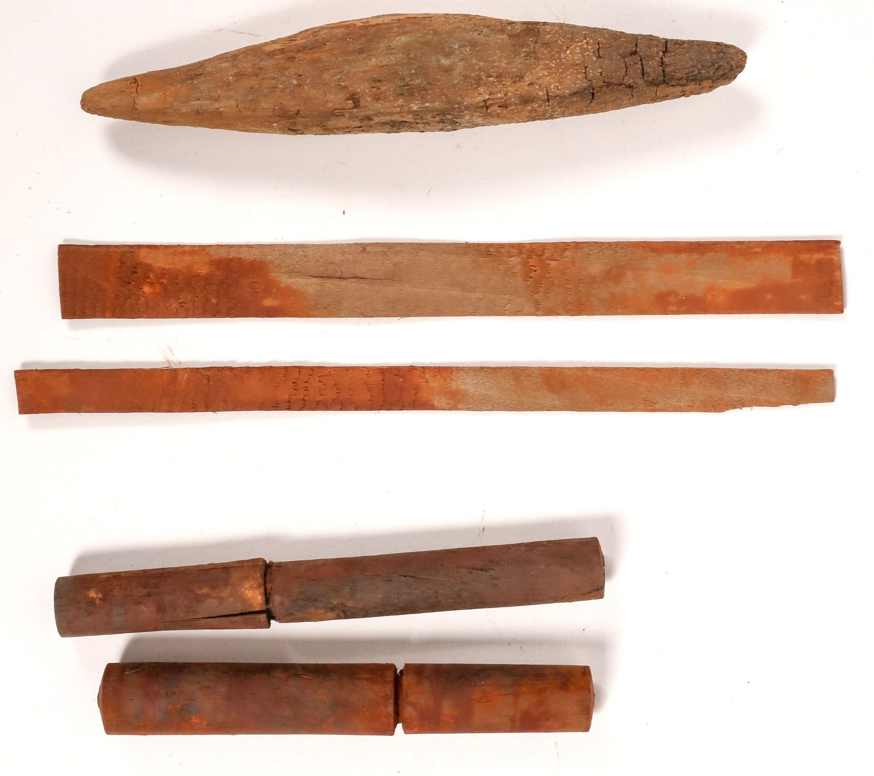 Lot of 5. 1) Two Wood Dowels, Unusual Function. These are two wooden dowels at 3.625 in. and the other 3.375 in. in length and 7/16 in. in diameter. Their purpose is not known, however one end is drilled to spin on a counter turned stem. The resulting device has a cap that turns on a shaft. Please see photos for details. 2) Oval shaped wood peg, likely used with rope or cord as a tie down anchor. 4.25x.75x.75" with small off center drilled hole on bottom. 3) 2 thin wood strips, possibly veneer used as wood trim. About 5/16x5 5/8" and .5x5 3/8". Staining.