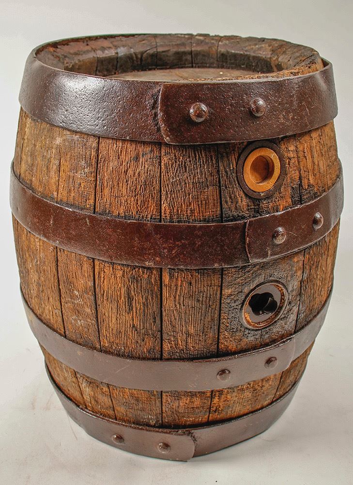 14 inch diameter at the top, 16 inch diameter at center, 18 inches tall. Wood stave constructed oak barrel with four concentric iron rings. Head of the barrel marked “G. Bauer, 227.” Three bungholes. G Bauer was the founder of the American Tobacco Co. from North Carolina. Bauer had a tough life, married Cherokee native Rachel Blythe, which was illegal in North Carolina law, causing him to locate the business at another site. Rare. (Al Adams Gold Rush Memorabilia Collection) Date: Location: North Carolina HWAC# 56871