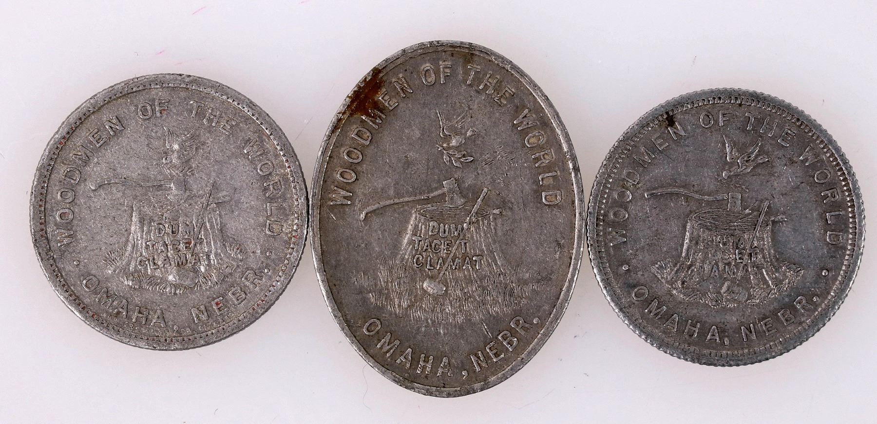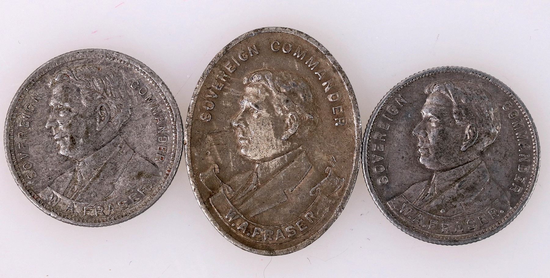 Three medals featuring W. A. Fraser sovereign commander of the Woodmen of the World. Two are round, 28 mm, one is oval 36 x 28 mm. Each with Fraser on the obverse and the fraternal insignia on the reverse. Woodmen of the World was founded in 1890, and William Alexander Fraser (1868-1932) was possibly the second president of the organization.