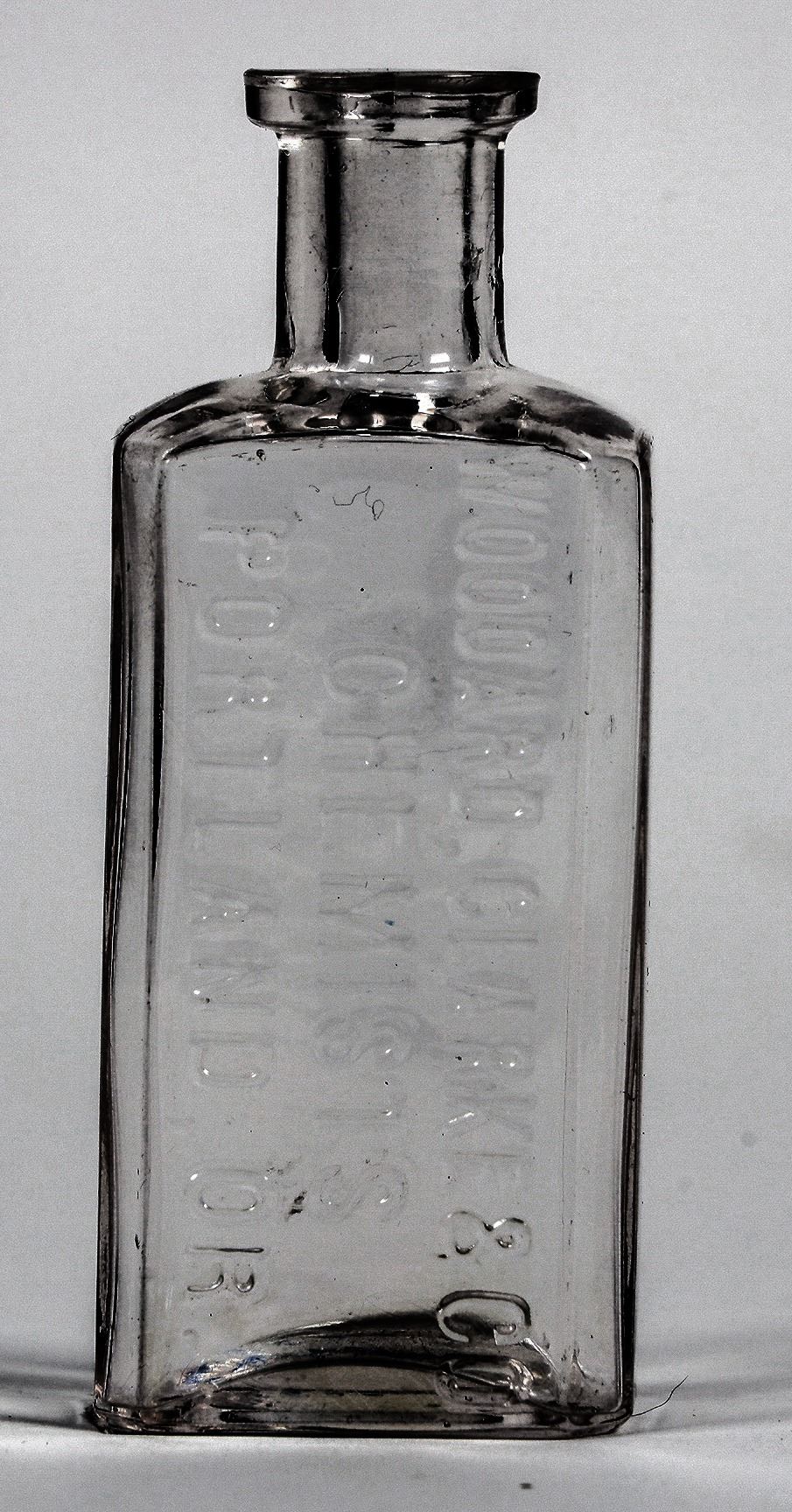 This lot is a clear bottle with "Woodward, Clarke & Co. Chemists, Portland, Or." boldly embossed on the front. Condition is excellent with no chips, cracks, or scratches, and it's made well, showing no signs of bubbling in the glass. Dimensions: 4 inches tall by approximately 1.5 inches wide.