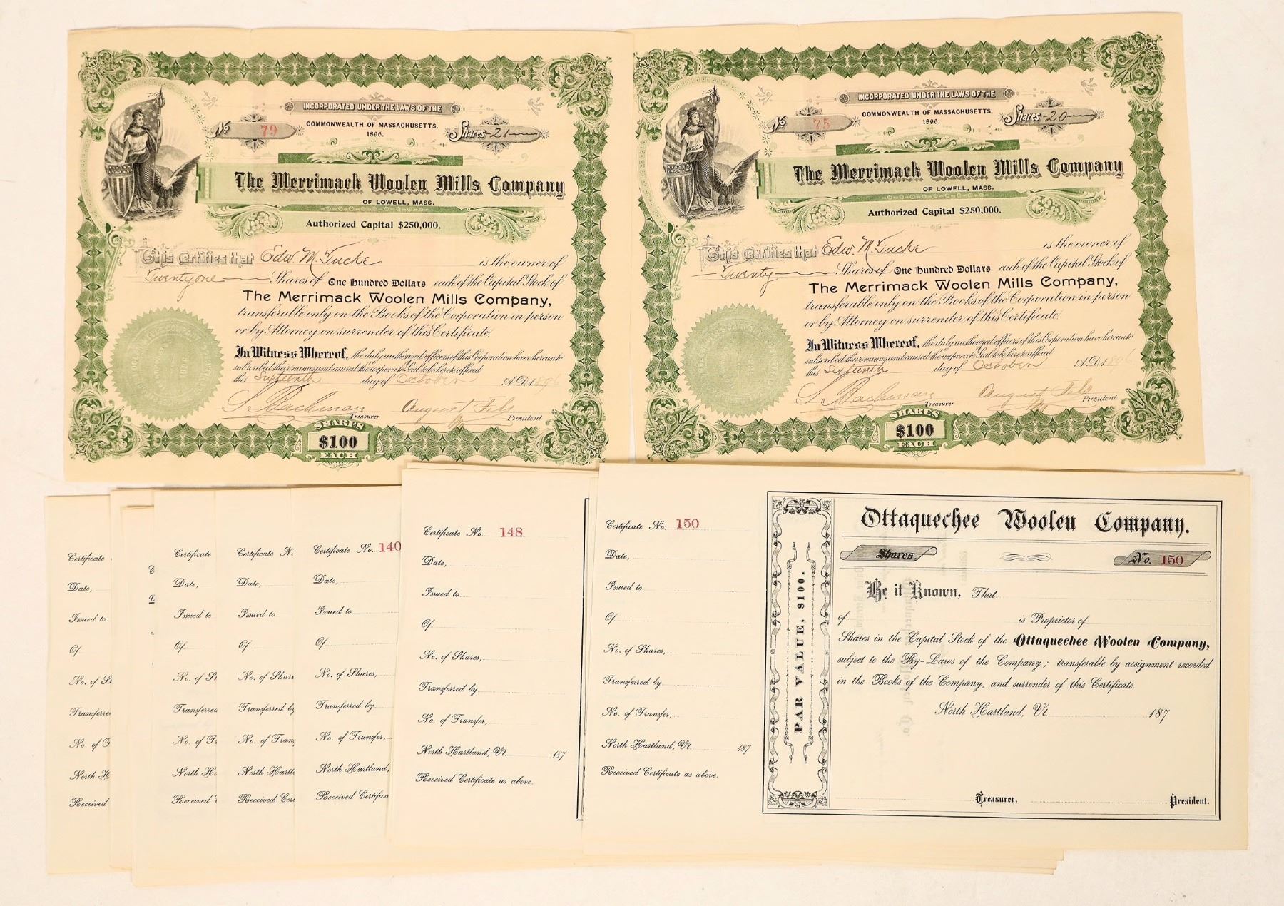2x 1896 Merrimack Woolen Mills, 15 c. 1870's unissued Ottaquechee Woolen.