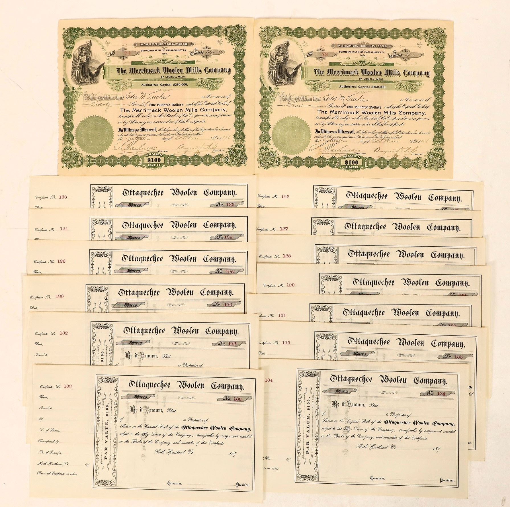 2x 1896 Merrimack Woolen Mills, 13x unissued Ottaquechee Woolen.