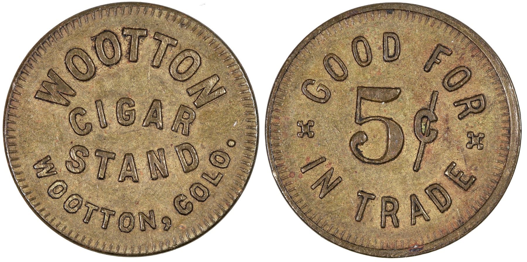 WOOTTON / CIGAR / STAND / WOOTTON, COLO. // GOOD FOR / 5¢ / IN TRADE; Br., rd., 22 mm.
