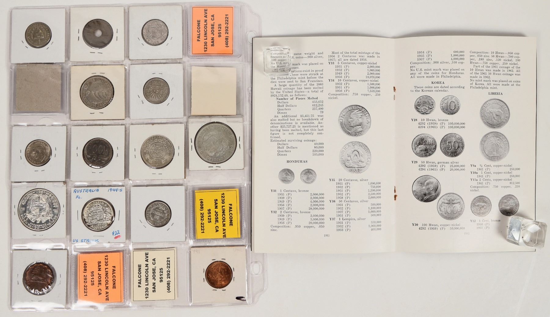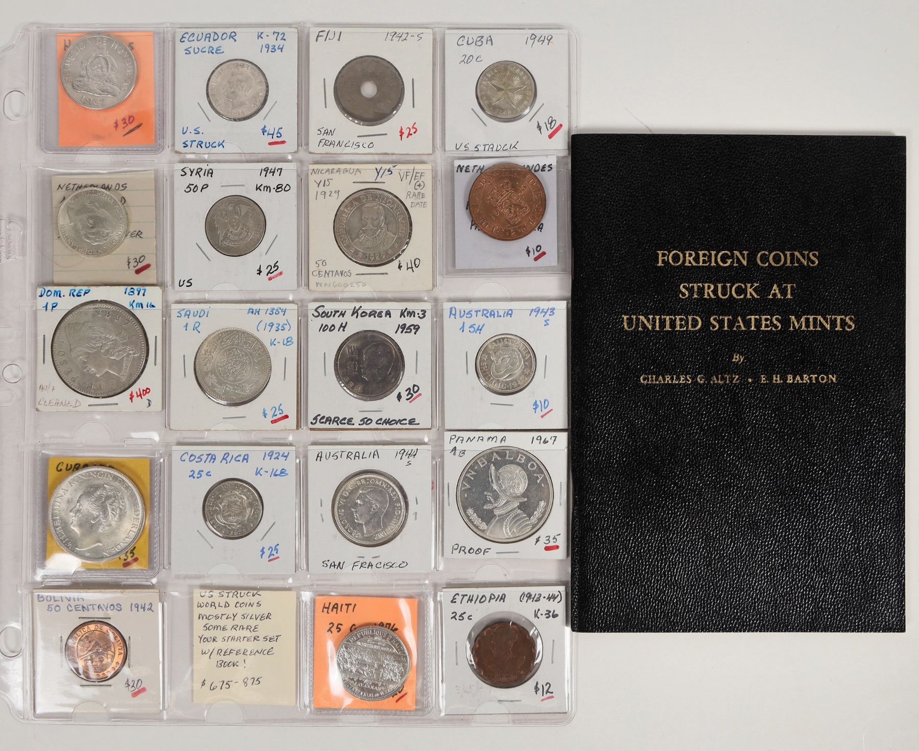 Starter set of 19 coins of the world struck at the U. S. Mint including the reference book "Foreign Coins Struck At United States Mint," by Charles G. Altz & E. H. Barton (signed by Barton). Mostly silver coins, many different countries.