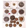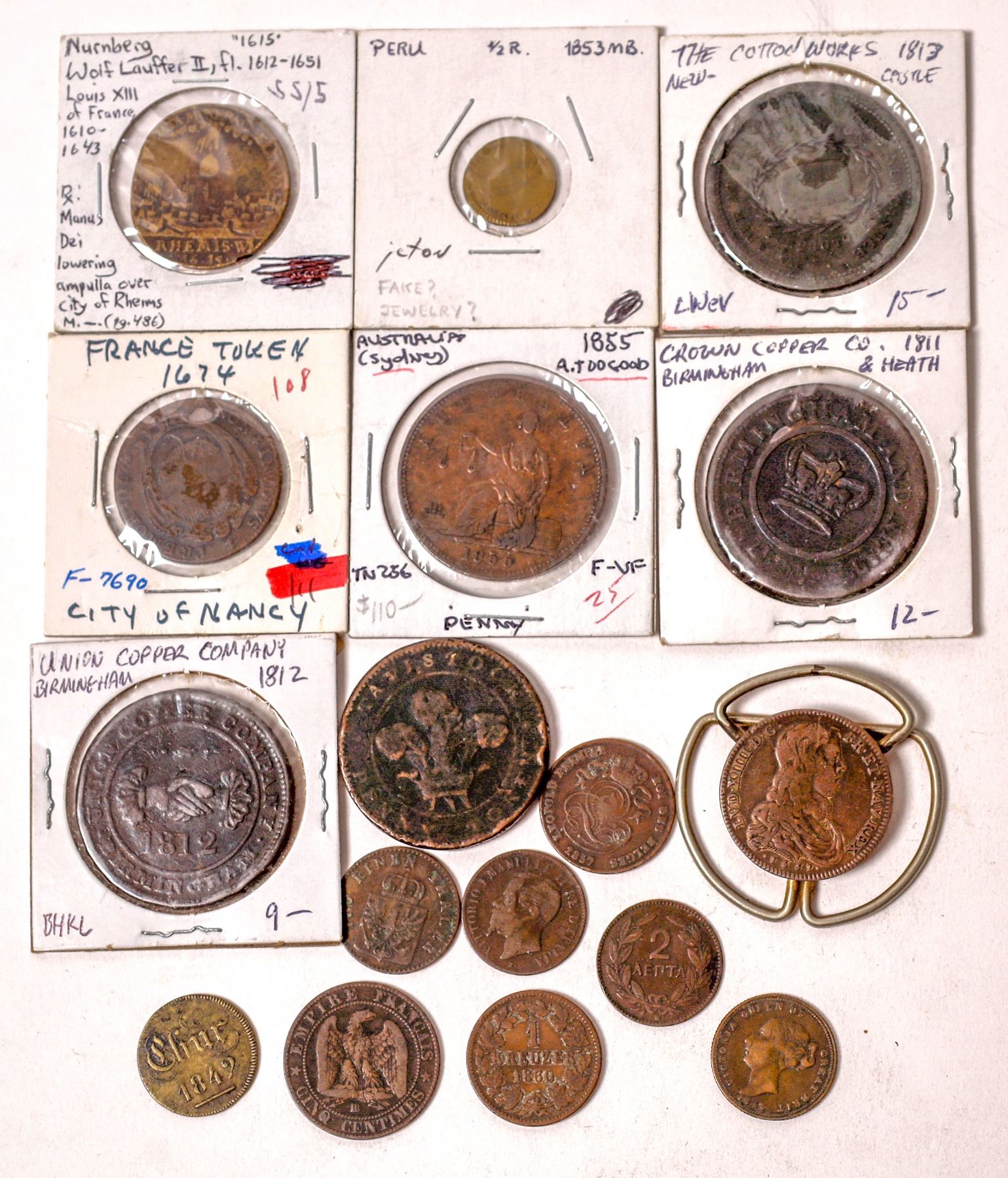 Lot of about 15 coppers from all over the world. 1812 Union Copper Company, Birmingham; 1811 Crown Copper Co., Birmingham; 1855 Sydney Australia merchant penny; 1813 Cotton Works, Newcastle; 1842 Switzerland; 1674 French token; 1853 Peru piece; other 19th century copper coins.