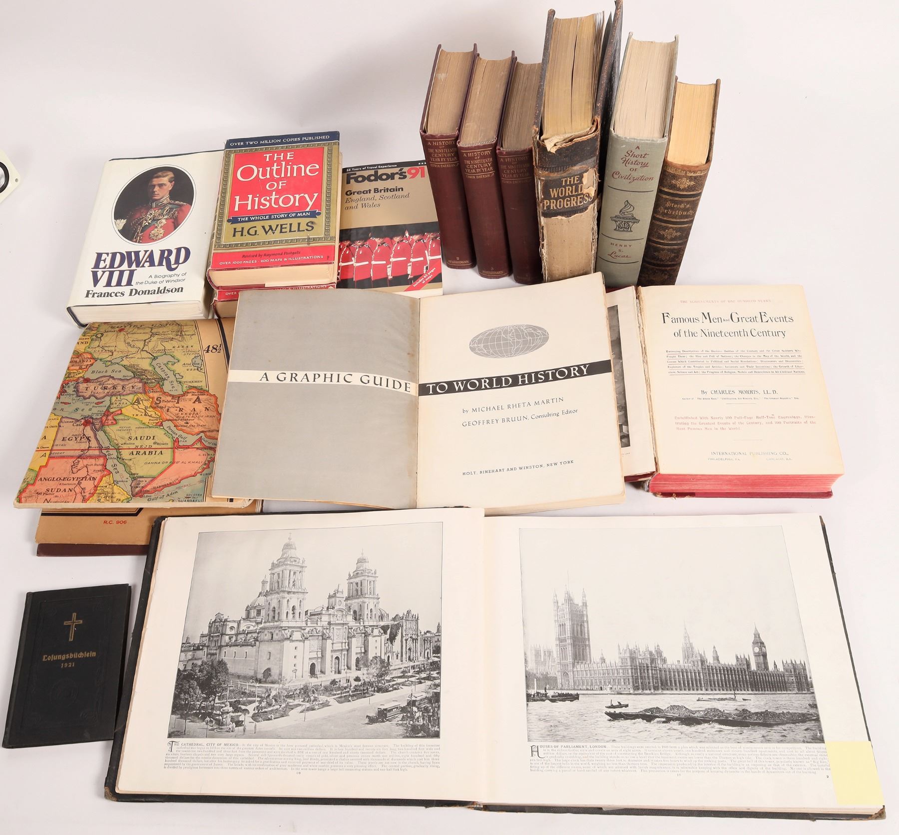 14 World History books. Starcks Gebetbuch, 2x The Outline of History by H G Wells, A History of the 19th Century by Emerson Jr Vols 1-3, Fodors Great Britain etc. See photo. About 32 lbs.