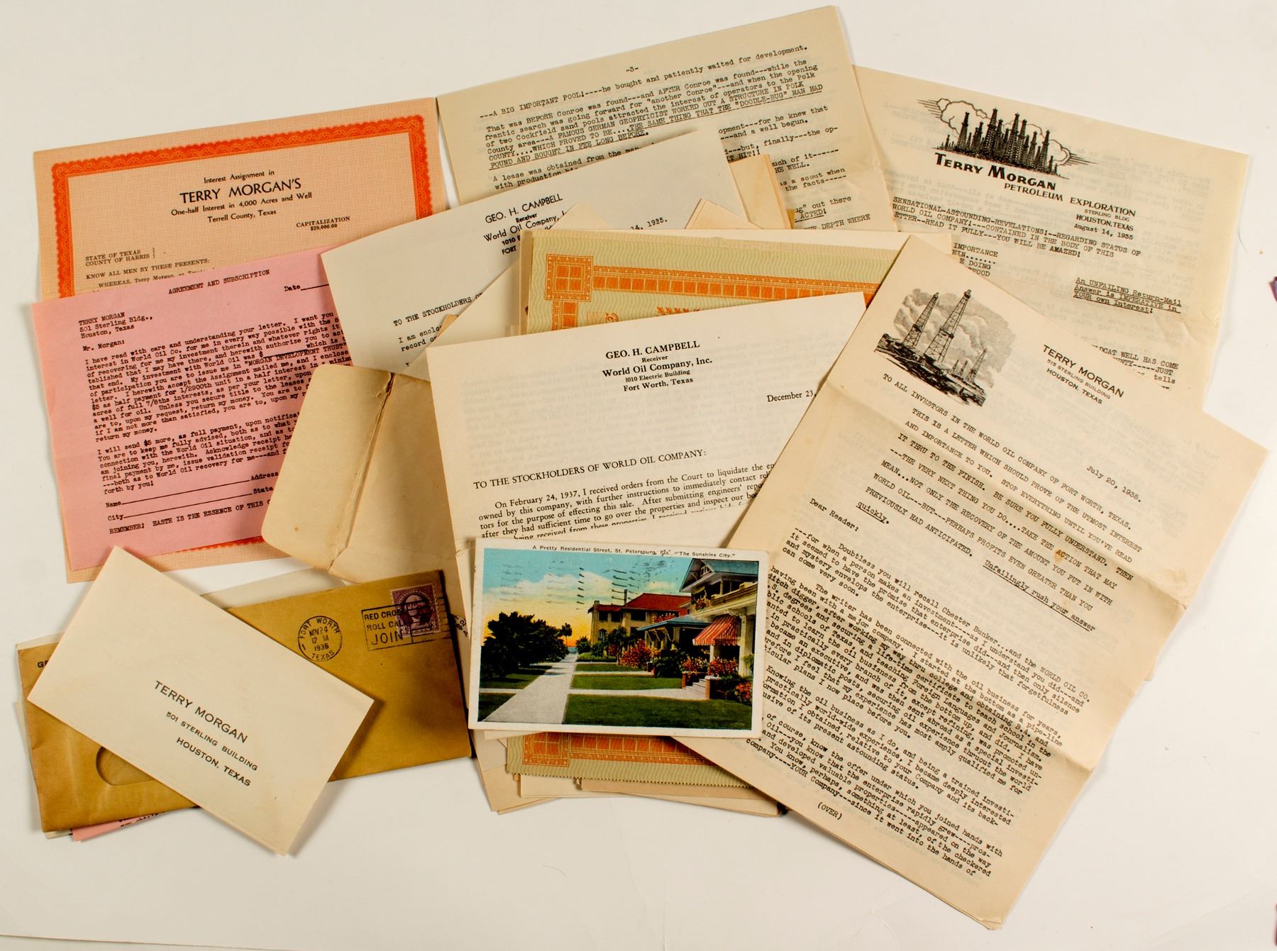 Lot of 36. Stock certificates and ephemera about the World Oil Company circa 1928-1936. Two stock certificates, 1925 and 1926. One article from Kamp & Company Mining and Oil Digest. 16 covers with corner advertising. 17 pieces of ephemera that match the covers. Two different oil great pictorial letterheads from Terry Morgan. Lots of propaganda! BUT the most interesting piece of ephemera is from the Securities Commission of Texas. It starts, "We are receiving many inquires from various parties about the activity of a man named Terry Morgan, who has recently been arrested in Houston, Texas, and placed in jail in that city for violation of the Texas Securities act." Entire collection comes from A. C. Haugsted of Delta, Colorado.