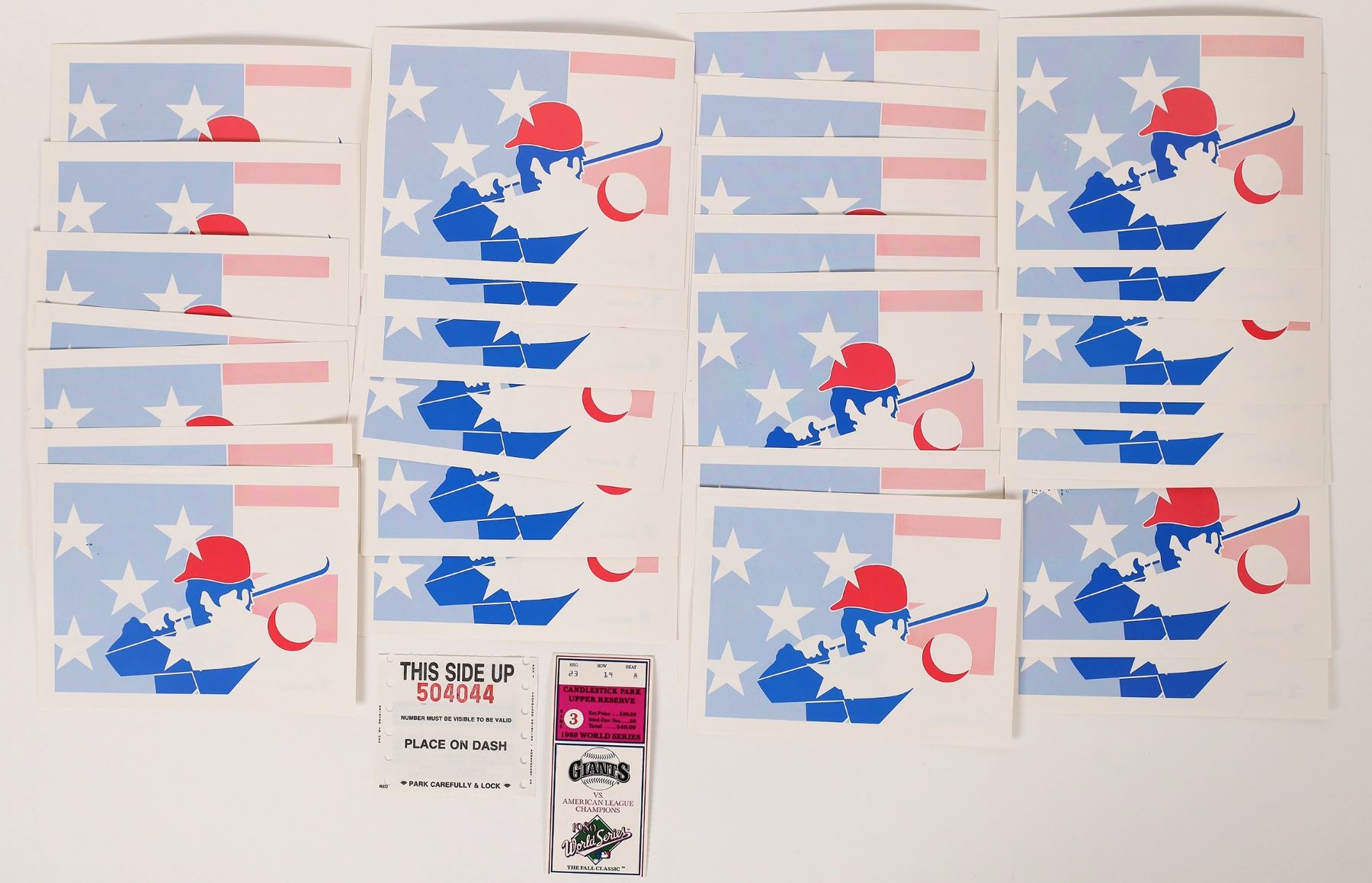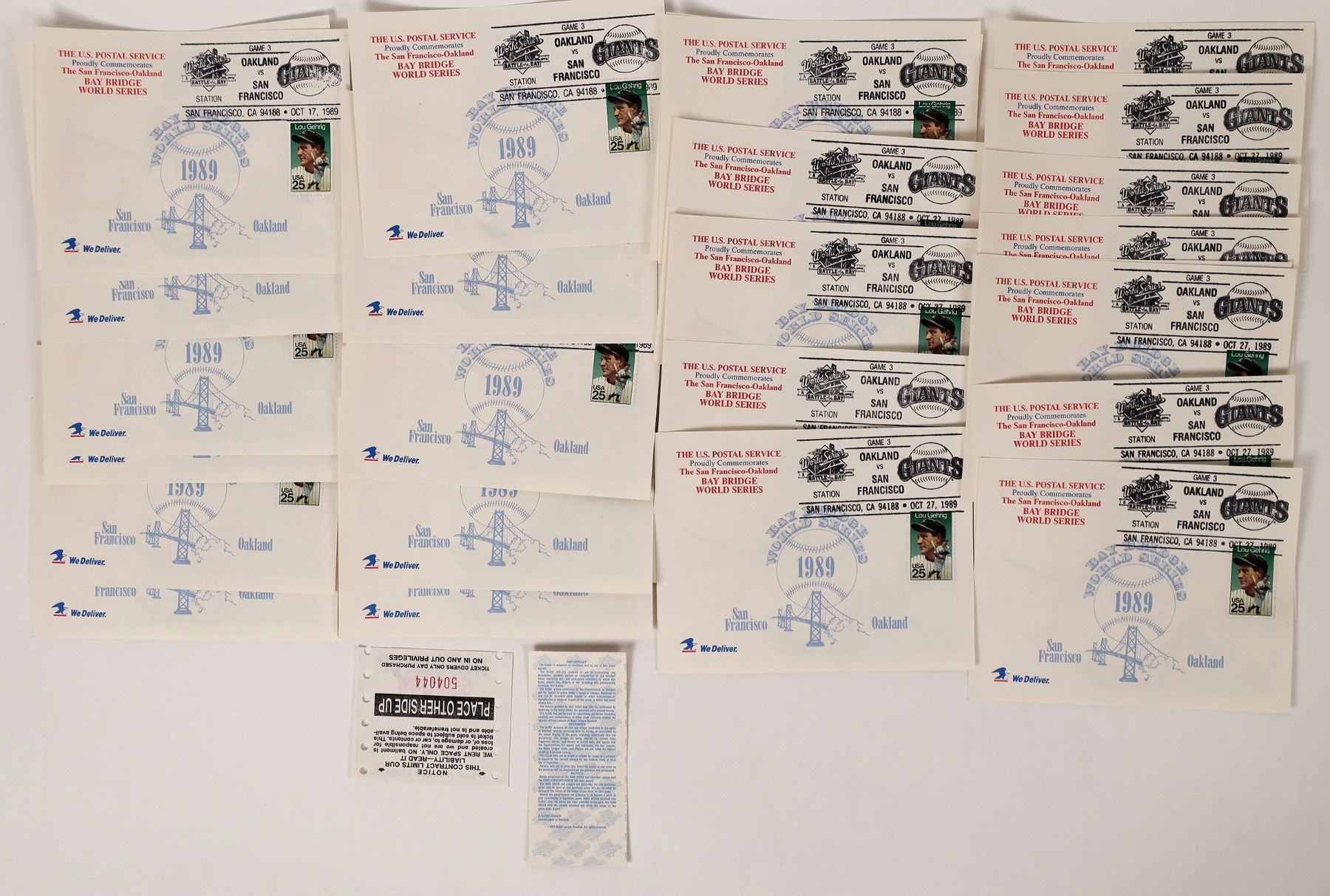 Earthquake Series commemorative postcards (28). These were issued on October 27, 1989, ten days after the World Series between the San Francisco Giants and Oakland Athletics was halted because of the devastating Loma Prieta Earthquake. Cards are stamp dated and have a Lou Gehrig 25 cent stamp. There's also a ticket stub from the third game of the Series. All in new condition. Please see photos for more details. California San Francisco 1989