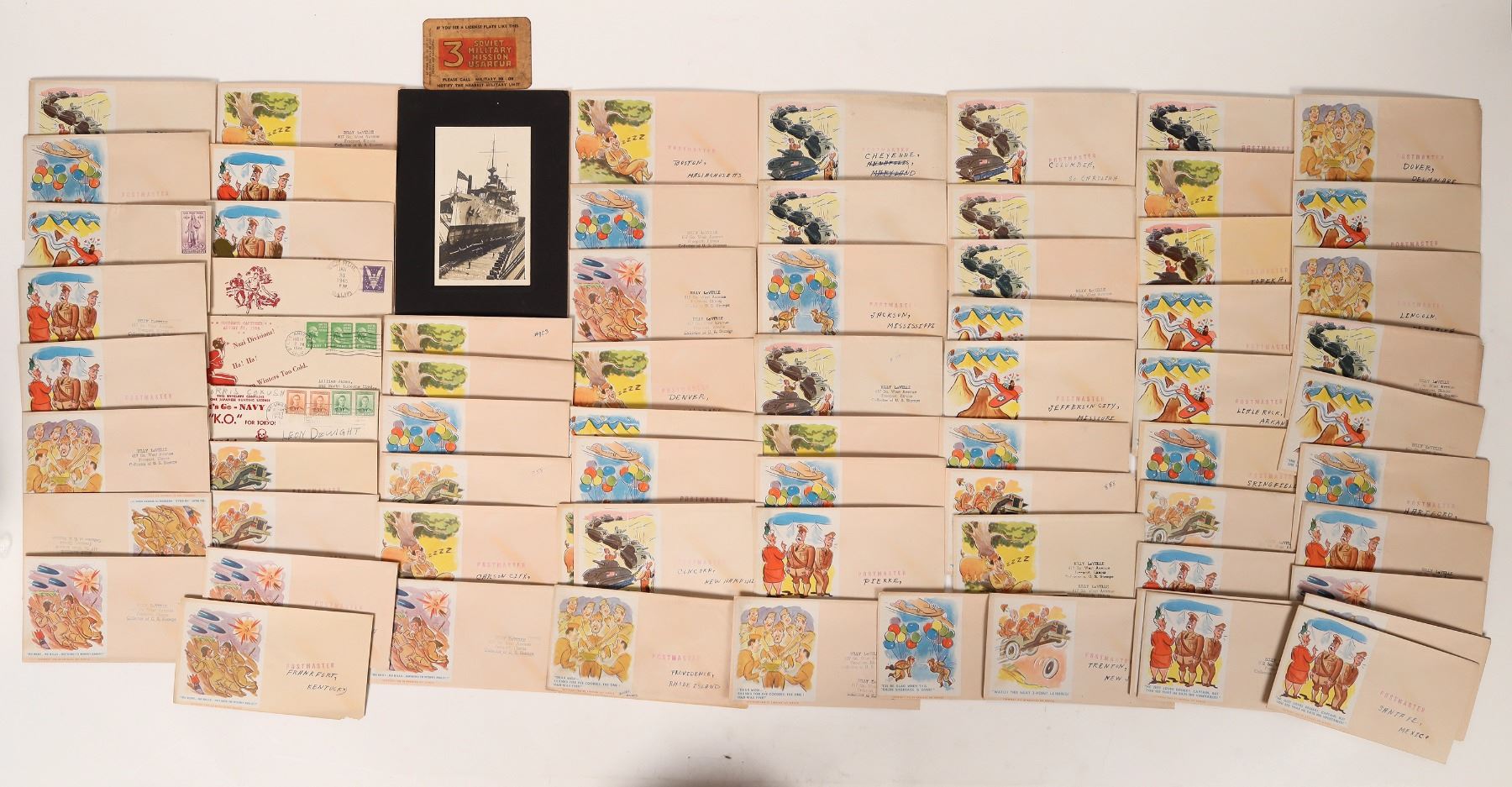 About 60 or more color cacheted covers with WW 2 themes. Most feature humorous themes or anti German or Japanese. Also 5.5x3.5" photo of USS Tennessee.