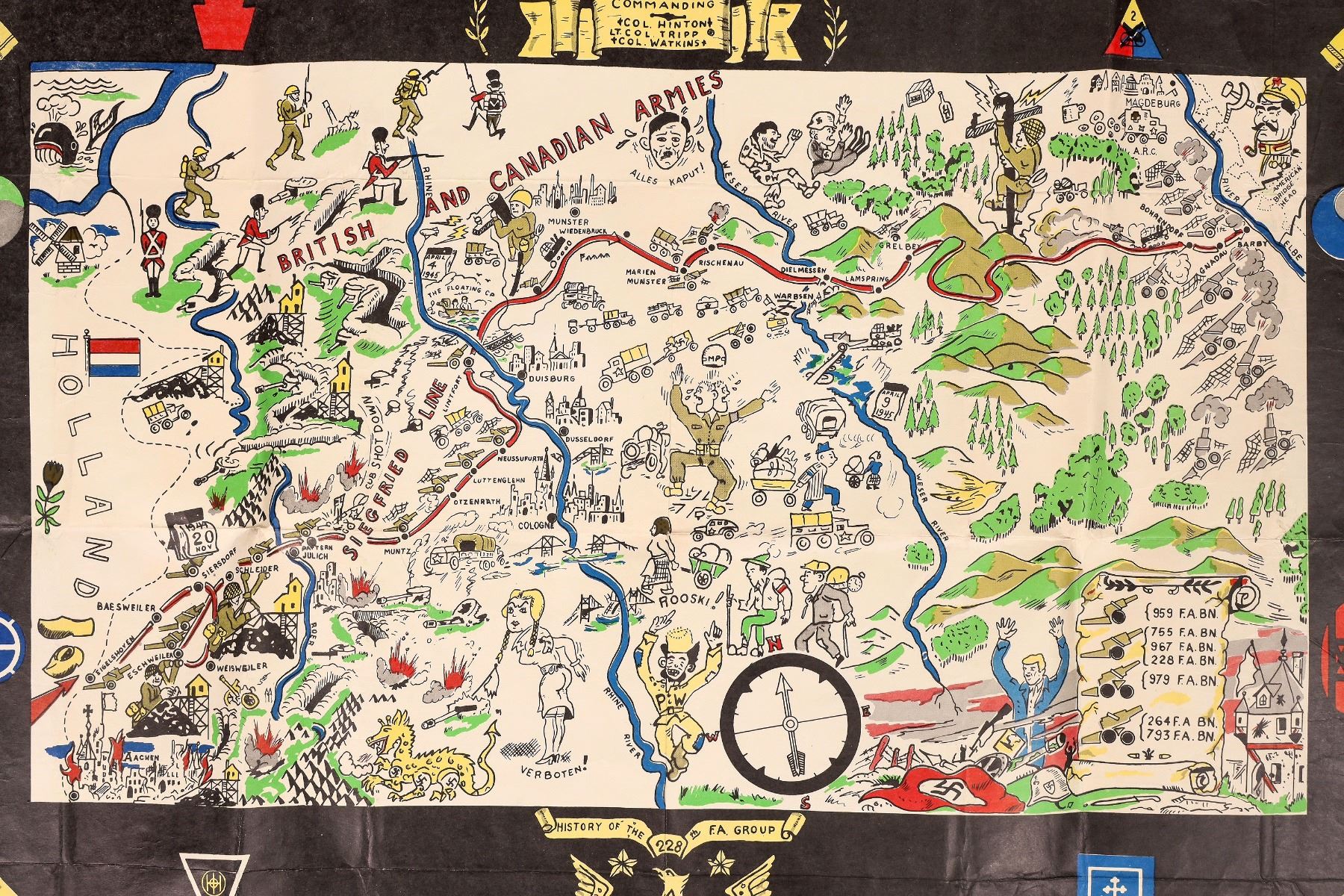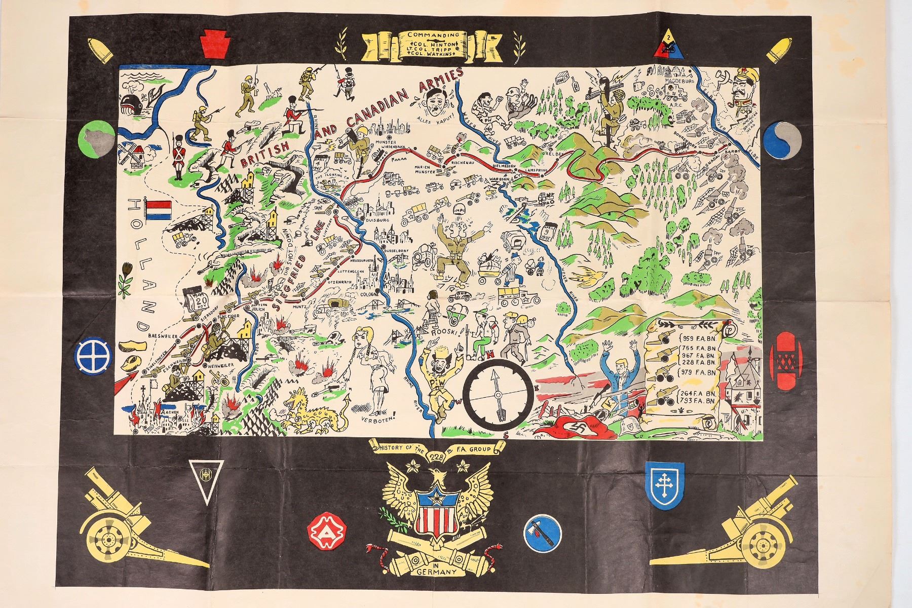 Rare World War 2 European color caricature map. Some mocking depictions of Axis enemies. Colonel John Hinton of the 228 F A(field artillery?) Group commanding. 22x28.5". Some staining and 1 corner tears, 1" upper tear. Please inspect.