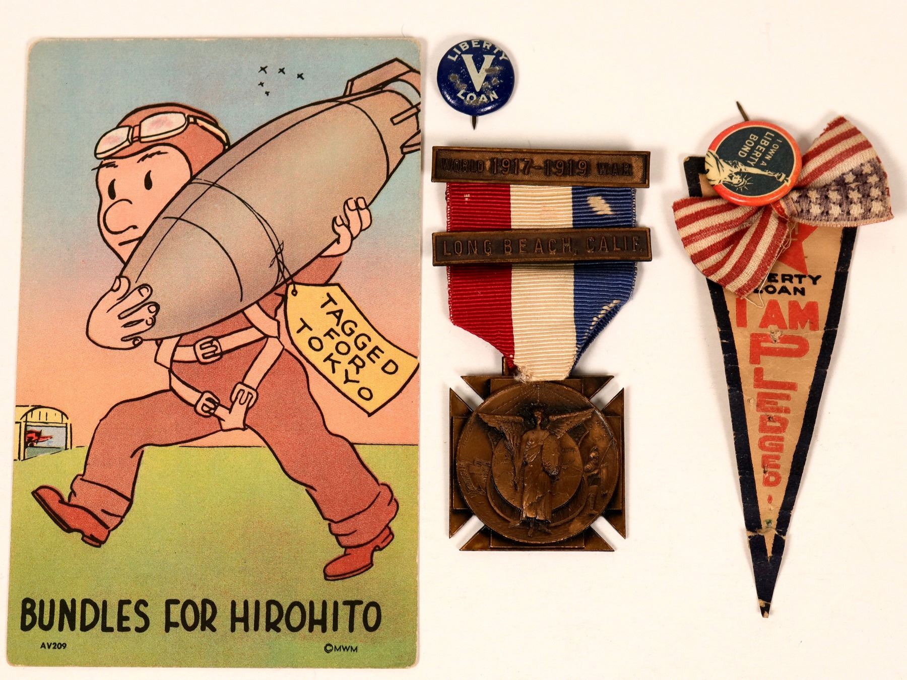 Lot of four includes a medal from the City of Long Beach, Calif., to a recipient, as embossed on reverse, "in grateful recognition of a duty well performed in the World War." Name of recipient was never engraved. Lady Liberty is embossed on the front, and medal has a red, white and blue ribbon with pin attached. 3-1/2 inches long. Also included are two liberty bond pinbacks, both 1/2 inch diameter, one reads, "Liberty V Loan," and the other "I own a Liberty Bond," with picture of Statue of Liberty and small bow and banner that says, "Liberty Loan I am Pledged!" A blank postcard of a cartoon of an airman carrying a missile, with sign "Tagged for Tokyo," and "Bundles for Hirohito," is included.