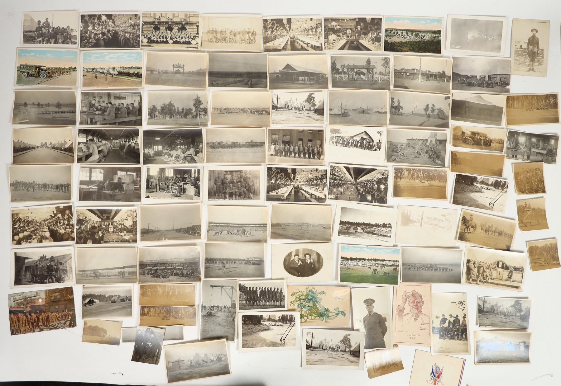 Lot of about 80 pieces. Mix of snapshots, photos, real photo postcards, and printed postcards. Camps, soldiers training, soldiers posing, etc. Please inspect.