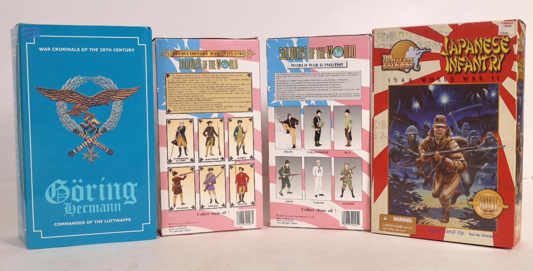 A lot of 13 action figures and vehicles from the GI Joe, Ultimate Soldier and War Criminals of the 20th Century toy (?) lines. Figures include Revolution, Civil War and WWII figures, like a Japanese infantryman and Luftwaffe leader Hermann Goring (Don't ask me, I only describe the stuff). There is also Sherman tank (About 25") , a US courier on a Harley Davidson and a German WWII motorcycle from "Ultimate Soldier. All are new in box. Please see photos for more details.